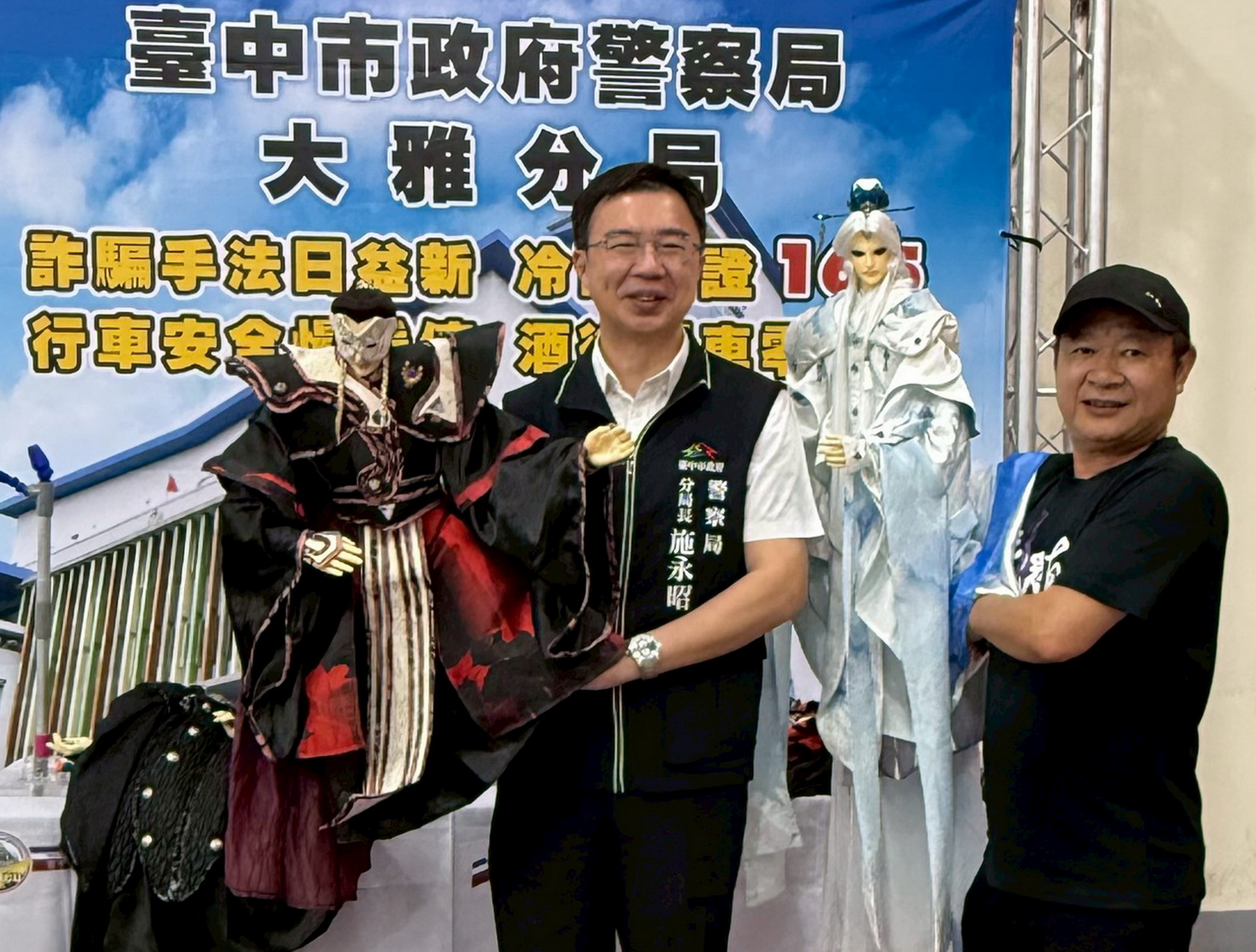 台中市大雅警分局跨界攜手霹靂布袋戲拍攝防詐影片,大雅警分局長施永昭、霹靂布袋戲經理謝育哲舉辦創新防詐宣導記者會,布袋戲角色素還真也現身會場。(記者陳金龍攝)