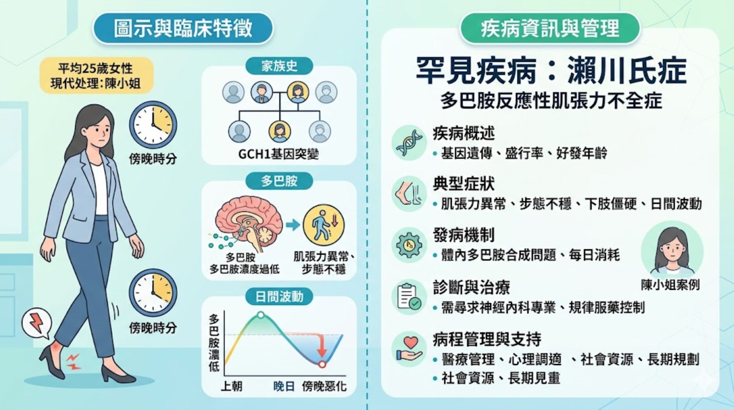 葉篤學指出,罕見疾病具有獨特的臨床特性與遺傳背景,對患者及其家庭都是充滿挑戰,需同步從醫療管理、心理調適、社會資源及長期規劃等四個面向因應;像陳小姐這類患者,在正確診斷與治療下,多數可控制症狀並維持生活品質,而隨著精準神經醫學等醫療技術持續進步,加上社會支持體系逐步完善,患者與家庭將能在更具希望的環境中面對未來。