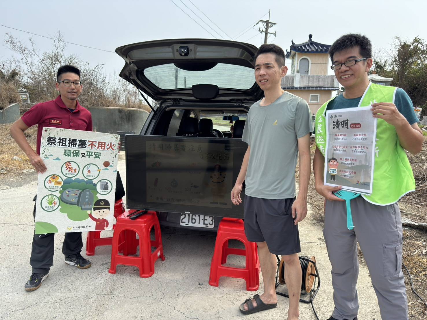 為維護林野墓地防火安全,北門消防分隊在各墓區懸掛防火布條、發放傳單,更在主要墓園出入口架設大型液晶電視,強力播放山林火災預防宣導影片。強調「給祖先看,也給子孫看」,希望透過科技化的視覺提醒,讓先人住得安心、讓子孫祭祖也更有誠心。