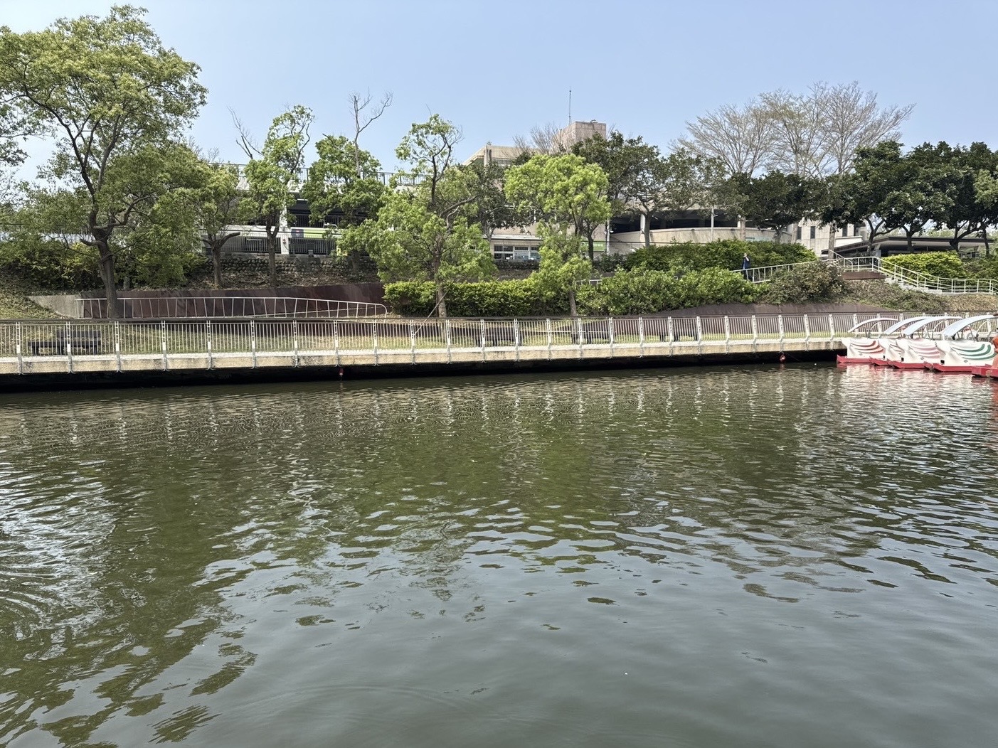 新竹市政府積極打造優質水岸環境,青草湖第三區(攔油索至環湖橋)水域的漂浮植物清理作業已階段性完工,有效恢復湖面景觀。(記者曾芳蘭翻攝)