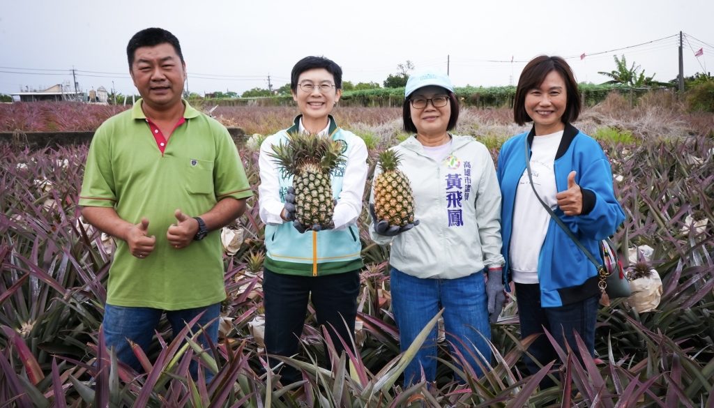 在大樹鳳梨準備「大出」的前一刻,高雄市議員黃飛鳳六日邀請立委林岱樺到大樹區,推廣大樹鳳梨,也一起彎腰下田,了解農民的辛勞,更品嘗一口鮮甜多汁的大樹鳳梨。