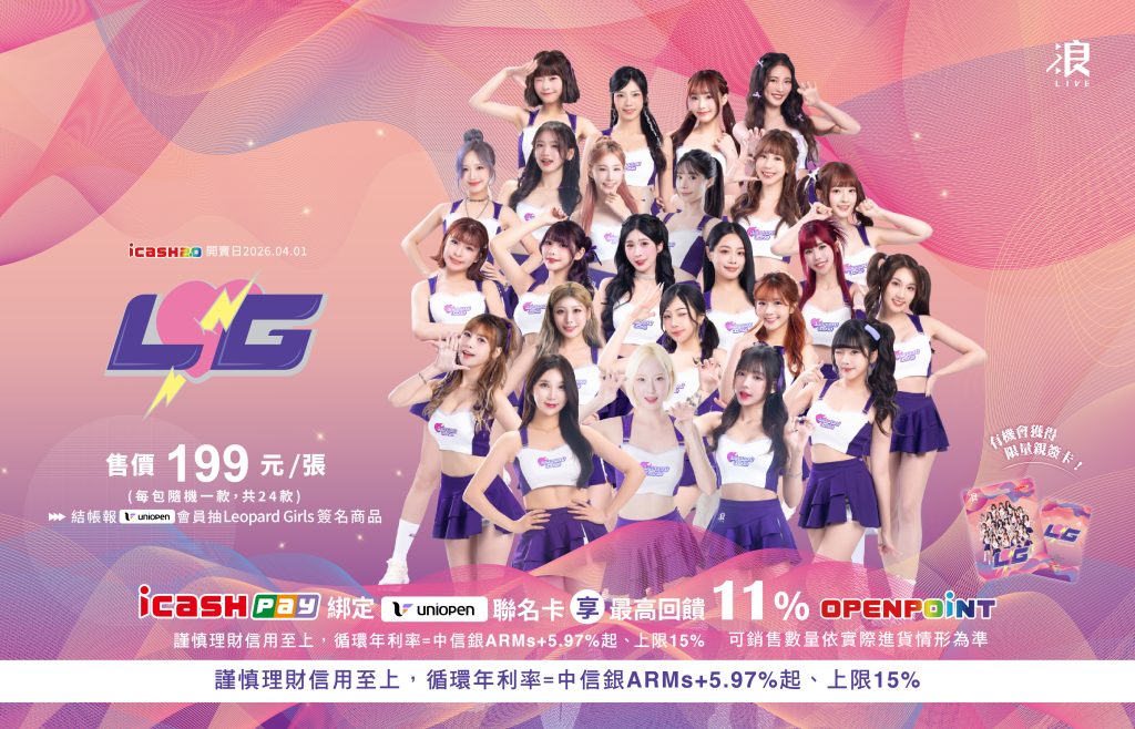 準備好感受球場上的最強電力了嗎?愛金卡公司首度與台灣職籃桃園台啤永豐雲豹隊專屬啦啦隊「浪LIVE電豹女」強強聯手,隆重推出「2026 Leopard Girls icash2.0」,一次集結全隊24位女孩,為每一位成員量身打造專屬個人卡款,每一張卡面皆捕捉了女孩們最動人的瞬間,這次發行採用「盲包」方式販售,除了隨機擁有一款女孩應援卡外,每位女孩更加入親筆簽名「隱藏卡」混入卡片中,當你打開包裝的那一刻,抽中的不只是女神,更是一份滿足驚喜感。為了回饋廣大粉絲,愛金卡更祭出了驚人的加碼活動:2026年4月1日至4月30日期間,只要購買此系列卡片並提供uniopen會員帳號,就有機會參加「全團簽名限定商品」的神級抽獎!無論是想要收藏心儀的本命,或是挑戰「全套收集」的霸氣,這波電豹女熱潮絕對是2026不能錯過的應援必敗單品!