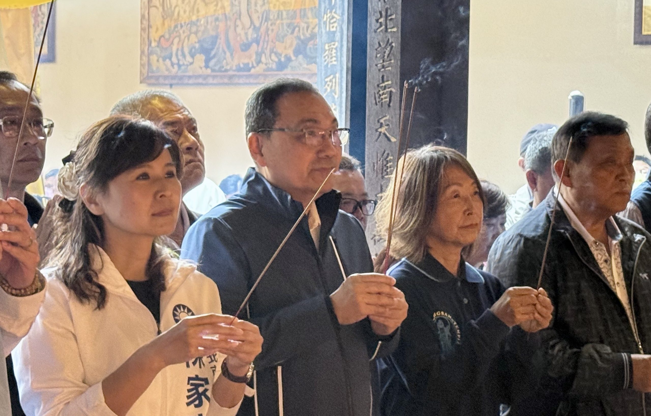 針對國民黨主席鄭麗文訪陸,新北市長侯友宜(前左二)六日強調以國家利益、人民優先。圖為侯友宜到淡水龍山寺參加觀世音菩薩誕辰參拜祈福活動。
