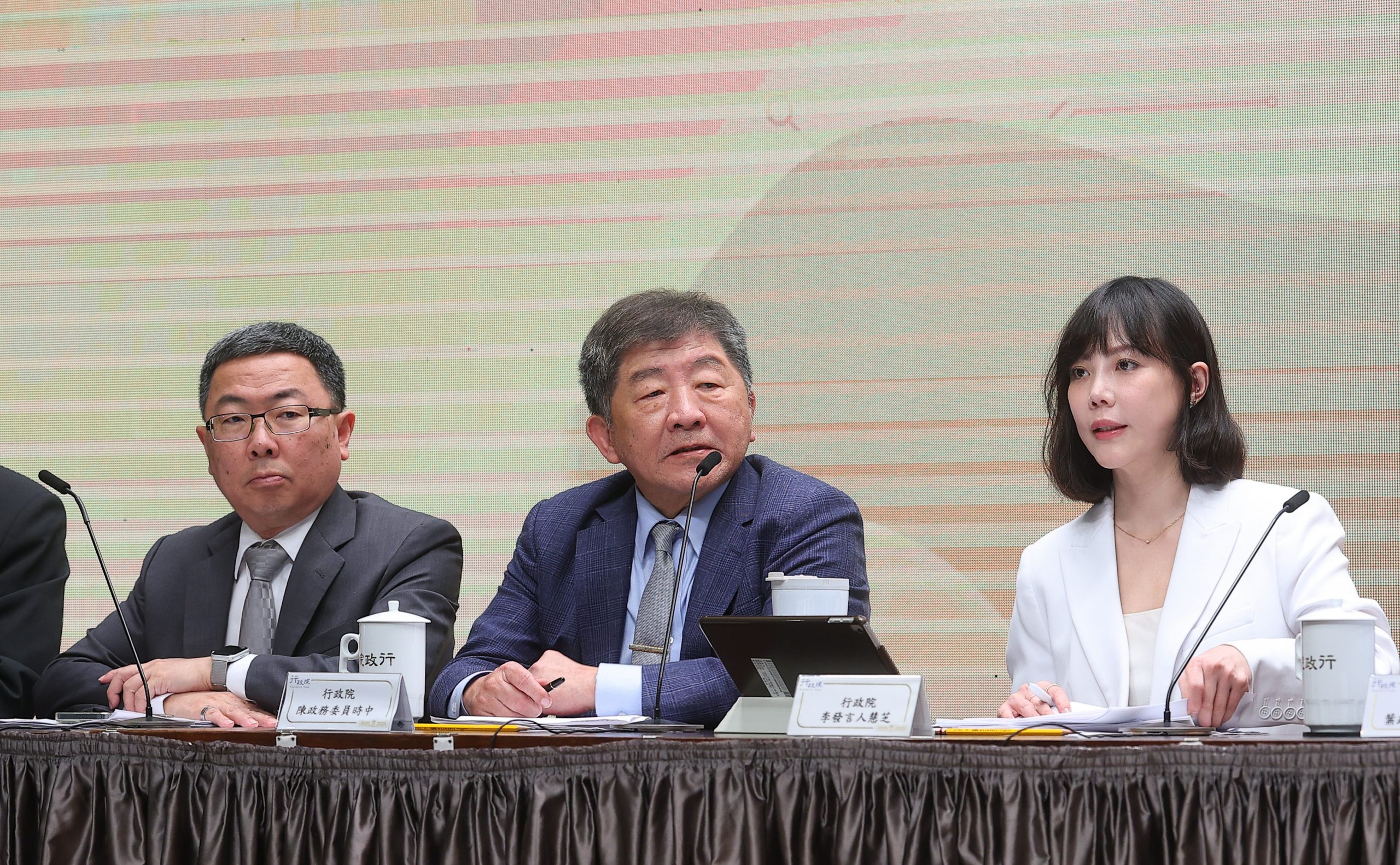 行政院六日舉行「因應中東衝突民生安定專案會議例行記者會」,由行政院發言人李慧芝(右)主持,政委陳時中(中)、林明昕(左)等人出席說明。 (中央社)