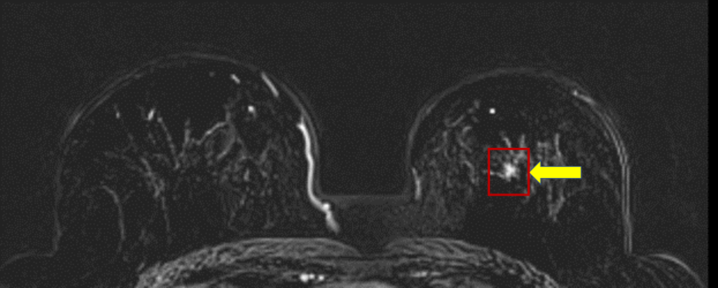 MRI檢查結果卻顯示異常,經判讀為第四等級,也就是屬於高度懷疑惡性腫瘤,醫療團隊隨即建議進行手術切片。患者在充分了解病情後立即同意手術,術後病理檢驗確認為約0.3公分之惡性腫瘤。所幸在癌細胞尚未侵犯周邊組織的原位癌階段,即被發現並切除,成功阻斷後續可能擴散的風險。