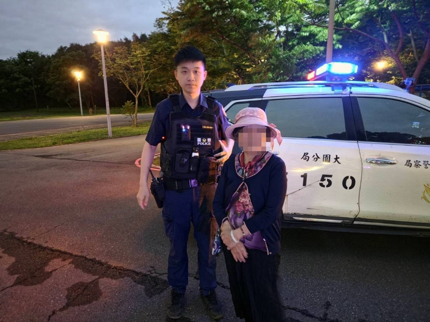 副所長吳而立、警員楊逸祥獲報後,立即根據老婦的衣著特徵及監視器畫面進行研判,認為老婦可能因不熟悉地形,誤走出公園範圍。員警隨即在周邊主要道路展開巡邏搜索,過了將近半小時,終於在距離園區一段路程的觀音區忠愛路三段,發現神色惶張的老婦。