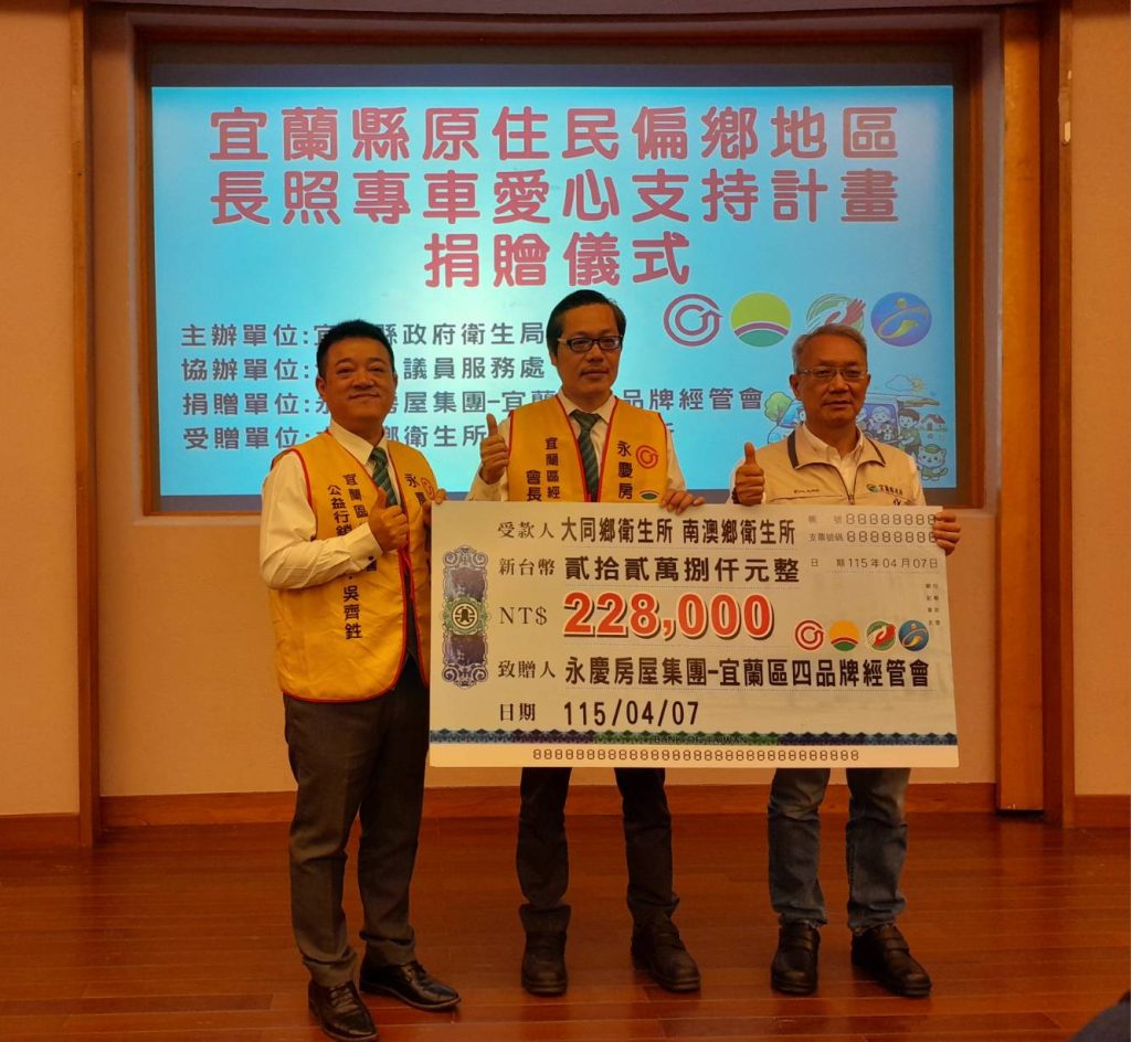 宜蘭縣大同與南澳兩山鄉因地處偏遠、交通往返不易,加上地形坡度落差大,長期以來影響長者就醫及參與長照及健康促進服務之便利性。當地青壯人口外移,人口結構以長者居多,使交通需求持續攀升。永慶房產集團宜蘭四品牌經管會有感於原鄉長者交通需求殷切,特別慷慨捐贈長照交通接送自付額經費,期盼減輕長者經濟負擔,讓更多長輩安心走出家門,參與社區活動,提升身心健康與生活品質。