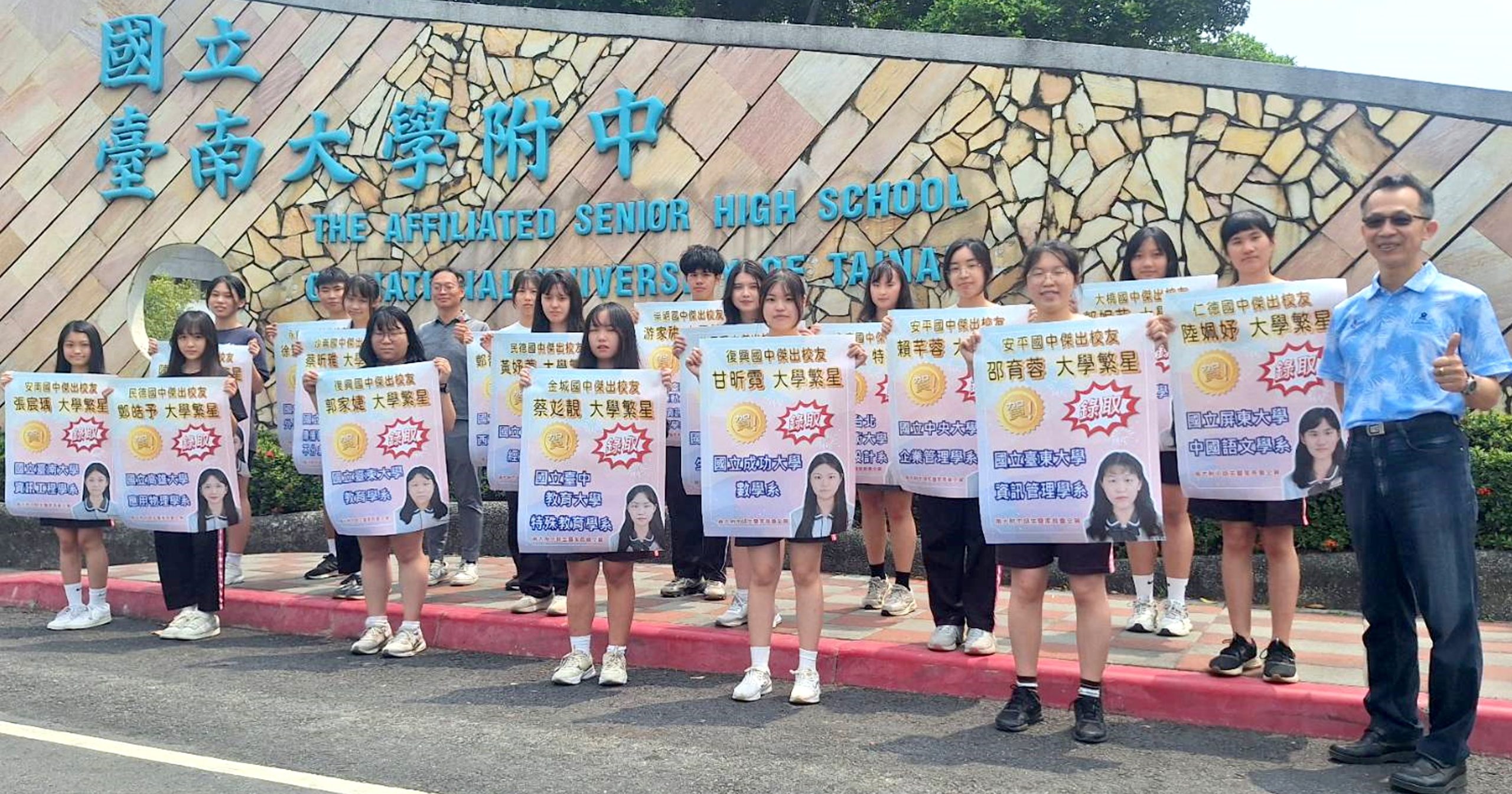 南大附中學生的好成績不僅是高中三年努力的結果,更要歸功於國中階段師長們打下的良好基礎。因此,由校長曾河嶸領軍帶領教務處團隊展開「感恩貼榜」巡迴。團隊帶著這批專屬錄取榜單海報,陸續前往學生的國中母校祝賀,包含永康、後甲、民德、復興、崇明、安南、安平國中等校,與國中的校長及老師們共同分享喜悅。