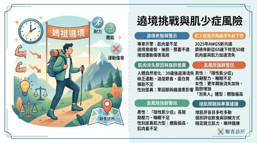 3月瘋媽祖,遶境動輒數十至上百公里的徒步行程,想跟上「女神」的勇腳,是一場對身體耐力與體能的考驗。專家示警,若肌肉量不足,遶境過程中可能易出現疲勞、抽筋與膝蓋不適,甚至增加運動傷害風險,建議50歲應篩檢。