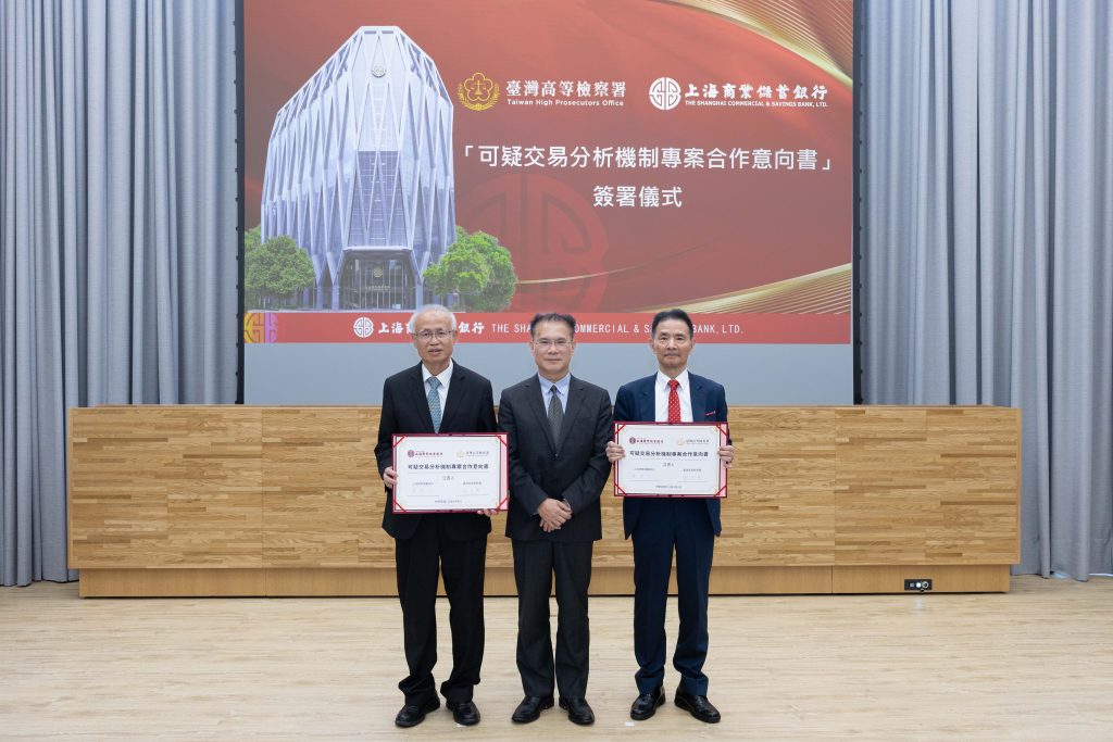 上海商銀與臺灣高等檢察署簽署「可疑交易分析機制專案合作意向書」,由法務部政務次長黃謀信見證(中) ,上海商銀總經理郭進一 (右)與臺灣高等檢察署檢察長張斗輝(左)代表簽署。(上海商銀提供)