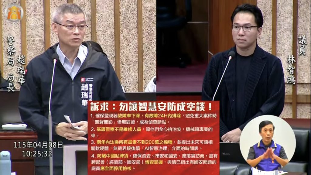 林智鴻質疑,致力於打造智慧城市的高雄,警用監視器趕得上AI發展嗎?他表示,老舊、畫素低、故障率高的監視器,恐將成為運用「主權AI」追緝犯罪的破口,且多數監視器竟仰賴警員修繕,目前所運用監視器佔約百分之十八之廠牌,去年還曾爆發「中國貼牌貨」假國產爭議。