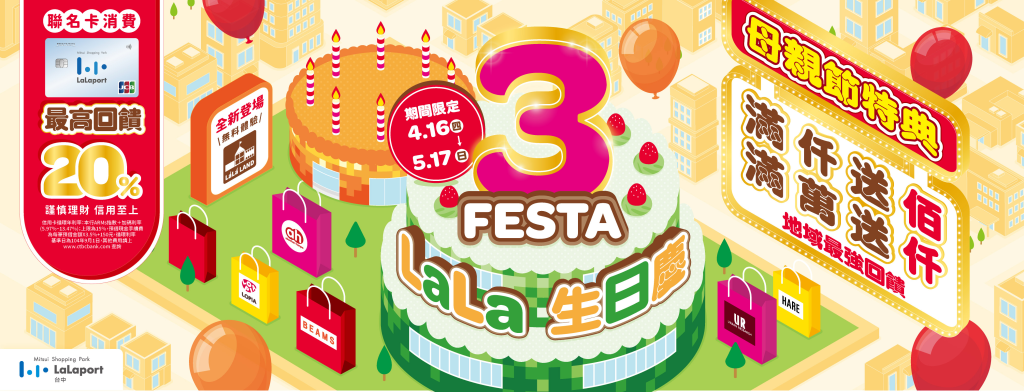 母親節適逢LaLaport台中三歲生日慶,全館好康絕對是加倍放大!4/16~5/17期間全館推出「3 Festa LaLa 生日慶」檔期,「滿千送百」回饋率最高15%,並可無上限累贈!活動共有兩波段: