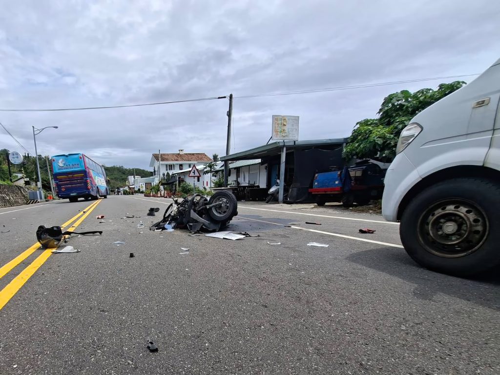 機車零件散落滿地,騎士送往台東馬偕醫院急救,仍宣告不治。經查自小客貨駕駛酒測值為0,相關肇事原因尚待進一步釐清。