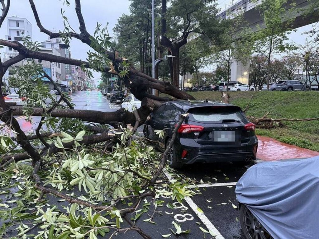 台中市北區南京東路與福樂街口八日清晨傳路樹倒塌事件,一棵路樹疑不敵連日豪雨侵襲,應聲倒塌橫躺路面,粗壯枝幹重壓路旁停放車輛,現場枝葉四散、路面濕滑凌亂,所幸未造成人員傷亡。
