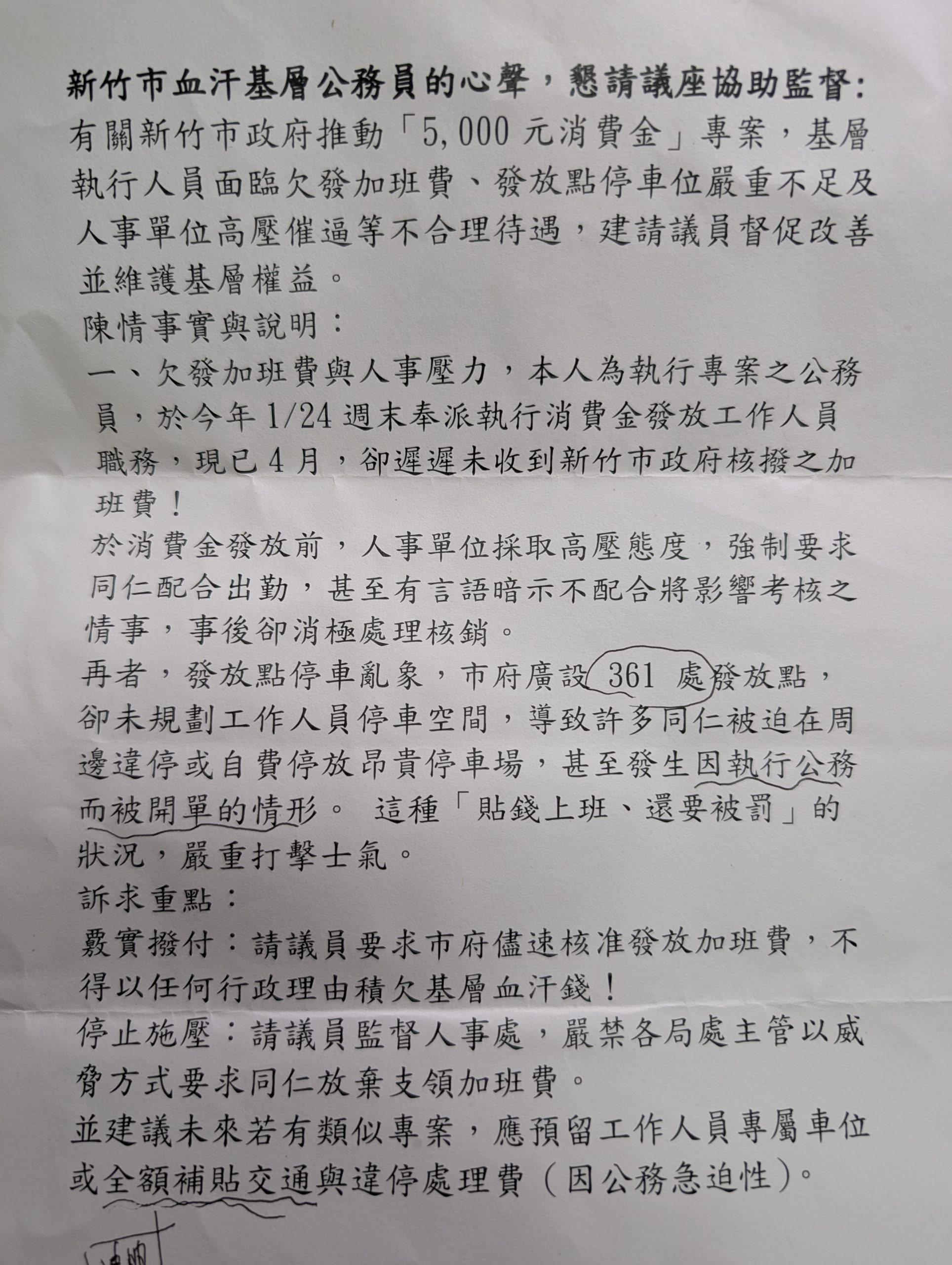 有新竹市公務員向市議員林彥甫陳情指出,至今遲未收到市府發放消費金五千元當日的加班費。(記者曾芳蘭翻攝)