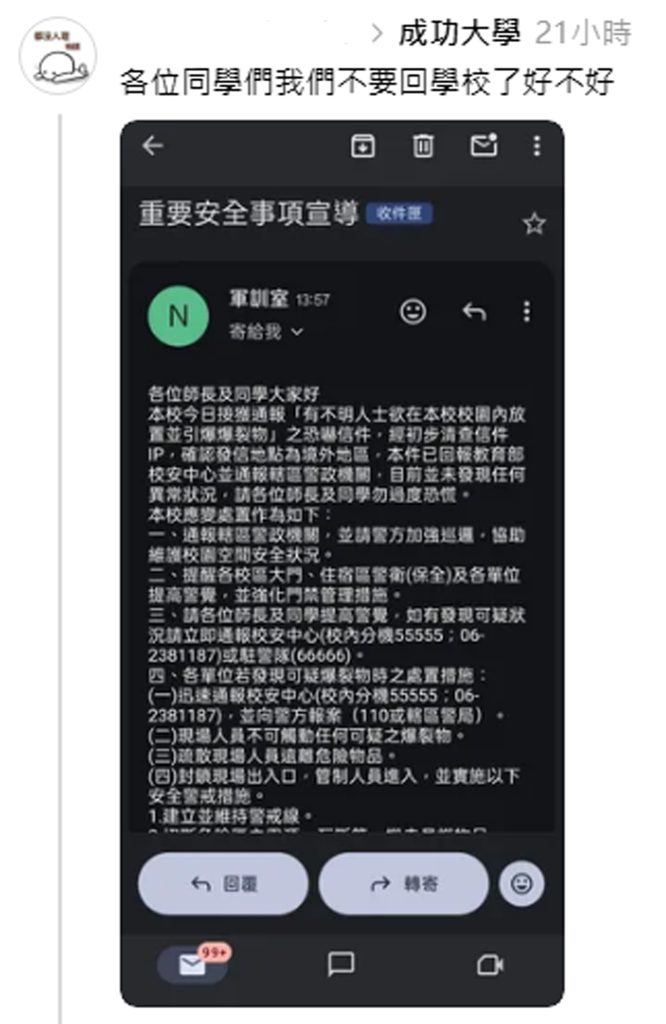 此外,社群平台上亦有自稱成功大學學生發文,貼出軍訓室通知信件並寫下「各位同學我們不要回學校了好不好」,引發網友熱烈討論。對此警方重申已完成全面檢查,未發現任何危險物品,呼籲師生毋須過度恐慌。