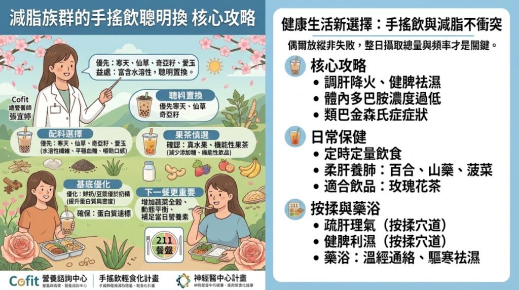 張宜婷強調,真正影響代謝健康的,是整天的攝取總量與頻率,而不是一杯飲品就判定減肥失敗。建立可長期維持的飲食態度,適度彈性與聰明置換,才是減脂成功的關鍵。偶爾的「放縱餐」是壓力的宣洩口,只要選對成分、算好比例,手搖飲也能成為健康生活的一部分,不必以全面禁止為唯一策略。
