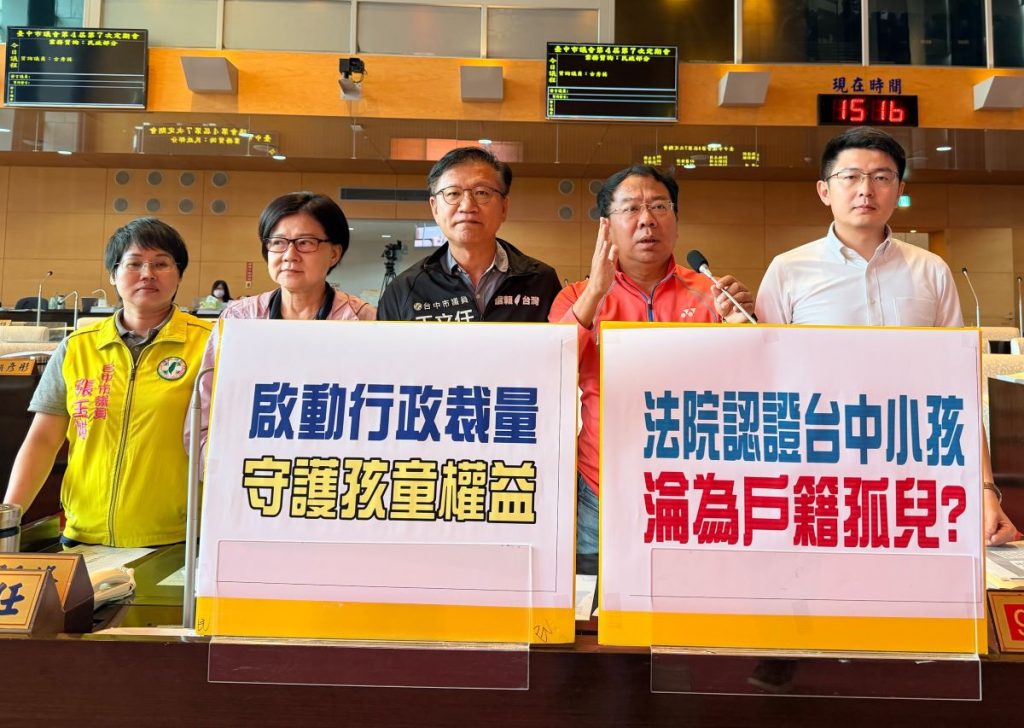 台中市議員謝志忠、王立任、張玉嬿、黃守達、張芬郁強調,在事證明確、法院判決已確定的情況下,市府更應展現積極作為,儘速啟動行政裁量機制,協助孩童完成戶籍登記,確保其基本身分與應有權益,讓孩子得以安心成長。
