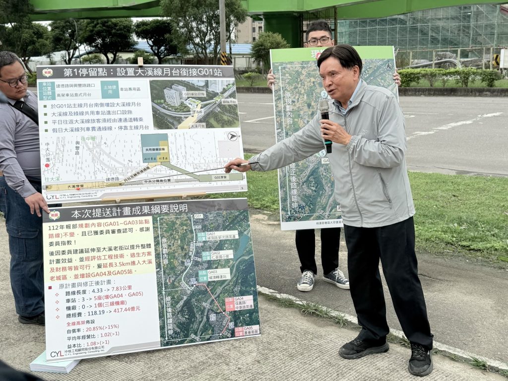桃園市政府強調,一一二年報部規劃內容(GA0一至GA0三站點路線)不變,且已獲委員審查認可,後因委員建議延伸至大溪老街以提升整體計畫效益,並經評估工程技術、逃生方案及財務等皆可行,爰延長三點五km進入大溪老城區,並增設GA0四及GA0五站。後續將持續配合中央審查作業,積極爭取行政院儘速核定。