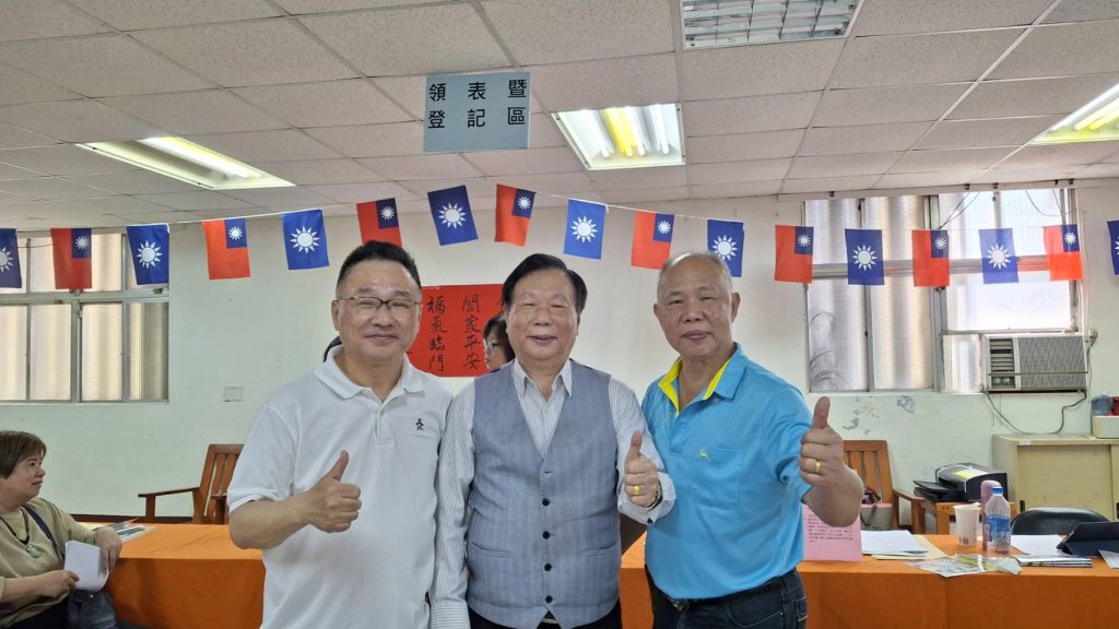 蘇澳鎮前鎮長陳金麟(中)捲土重來,前往國民黨宜蘭縣黨部完成蘇澳鎮長候選人登記,要讓蘇澳鎮藍天重現。(陳金麟提供)