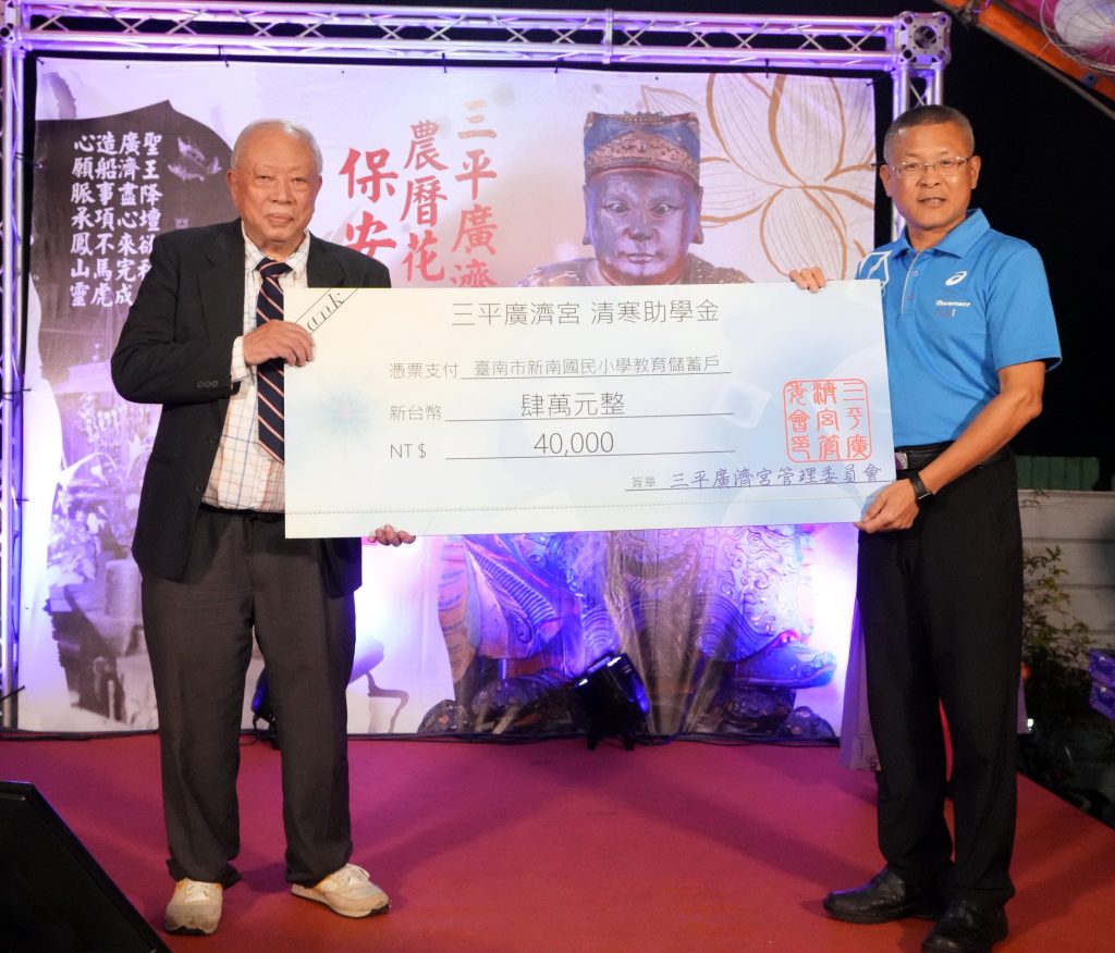 管理委員會奉神明聖諭,於每年春秋兩祭期間進行扶助弱勢的救濟活動,九日晚由主委謝建人將四萬元助學金交由新南國小校長魏萬能收執,這筆錢將存入教育儲蓄專戶,依照學校的審核機制補助給清寒學子能夠安心就學,減輕家庭負擔。