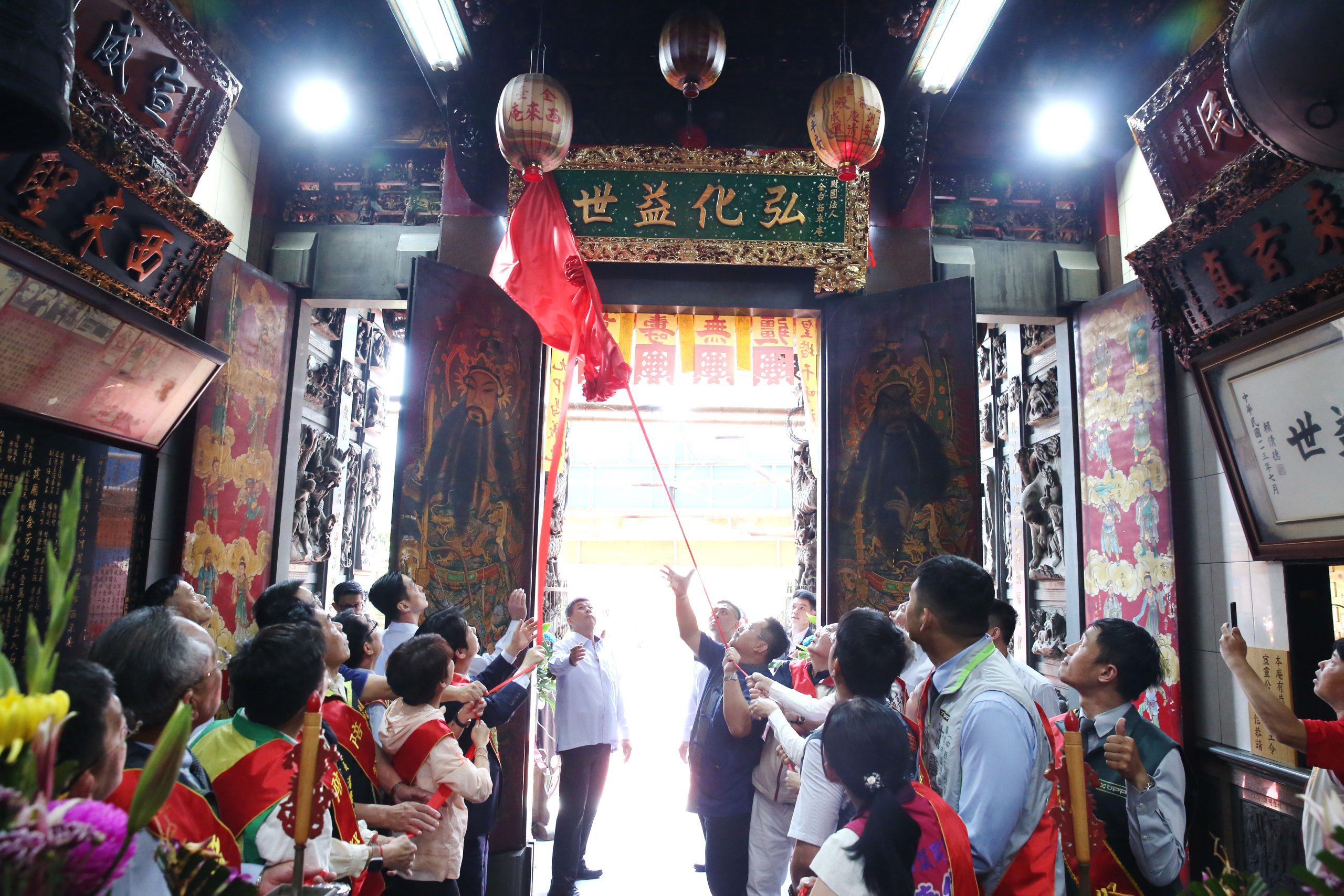 總統賴清德與貴賓們為所題「弘化益世」揭匾。(記者陳俊文攝)