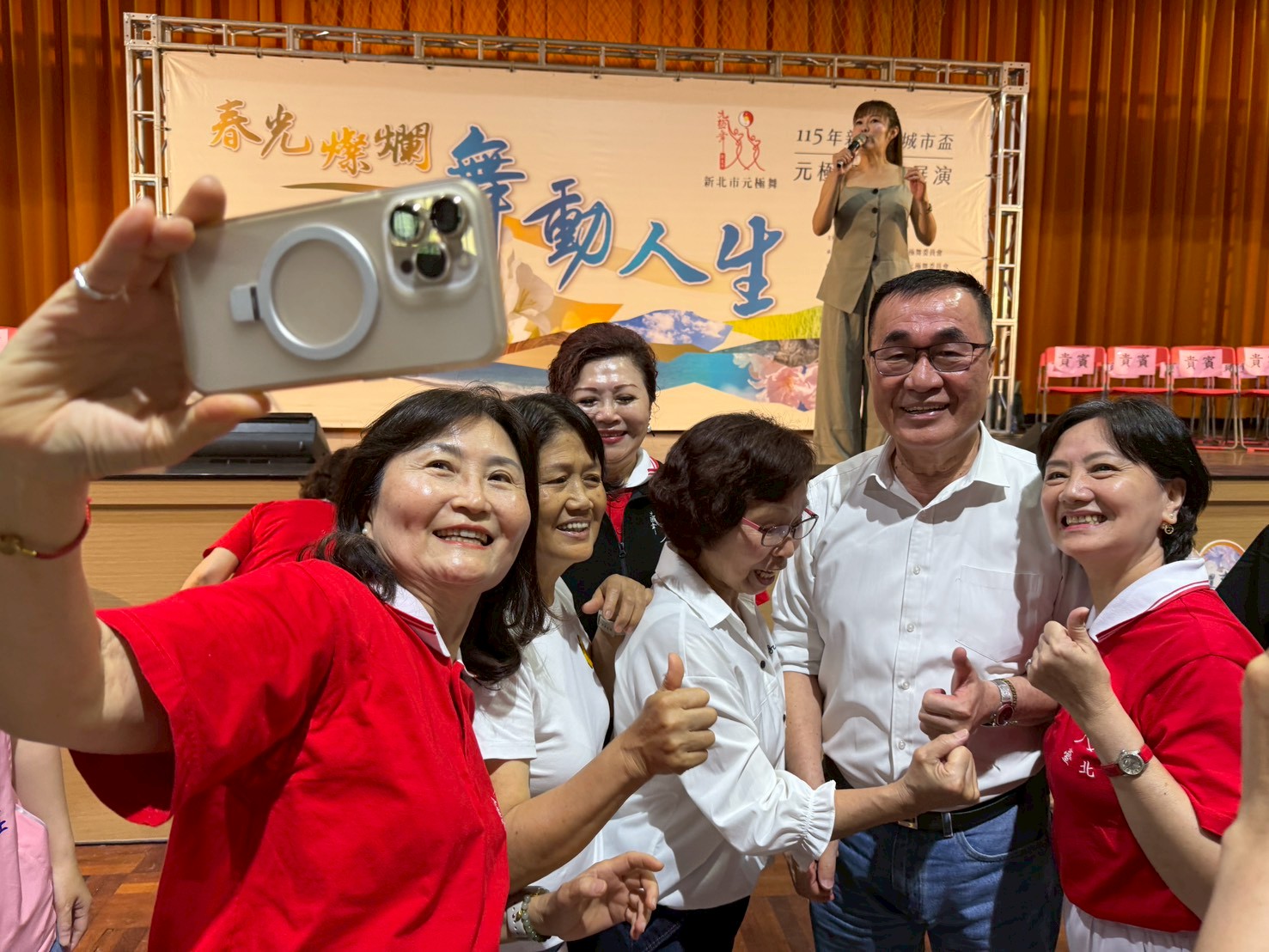 李四川今早至新莊出席新北市城市盃元極舞觀摩展演,與民眾開心互動。李四川競選辦公室提供