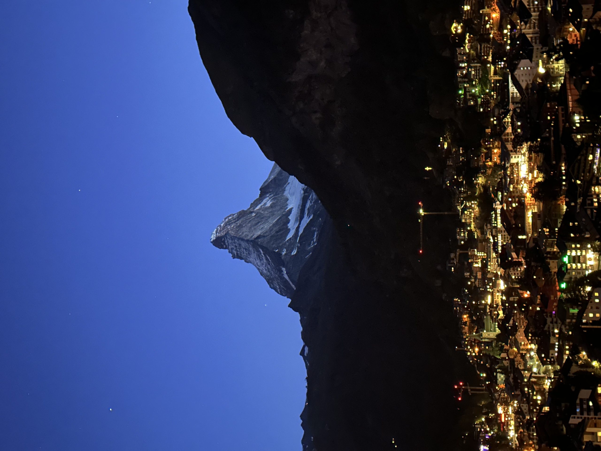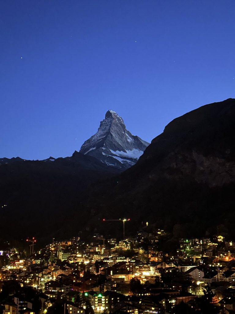 晨曦中的馬特洪峰,猶如一顆世界最昂貴的黃金熔岩巧克力。望著剛從山頭冒出的一點橘紅,接著緩緩流漫成整顆的璀璨金黃,雖然無法融化在已目瞪口呆的嘴中,但早已融化在小鹿亂撞的心裡。向晚時分,登上觀景臺不僅可以俯瞰策馬特,還可以遠眺馬特洪峰。望著從暮色微光漸漸調染成黛藍的夜空,整片華燈閃閃的策馬特就像繁星墜落的星海,而遠方的馬特洪峰彷彿被釀萃成一瓶世界最高檔的藍牌威士忌。在策馬特,冒著二到四度的低溫,能品嘗到馬特洪峰晨間的甜與夜裡的醉,我想這樣的等待是值得的。