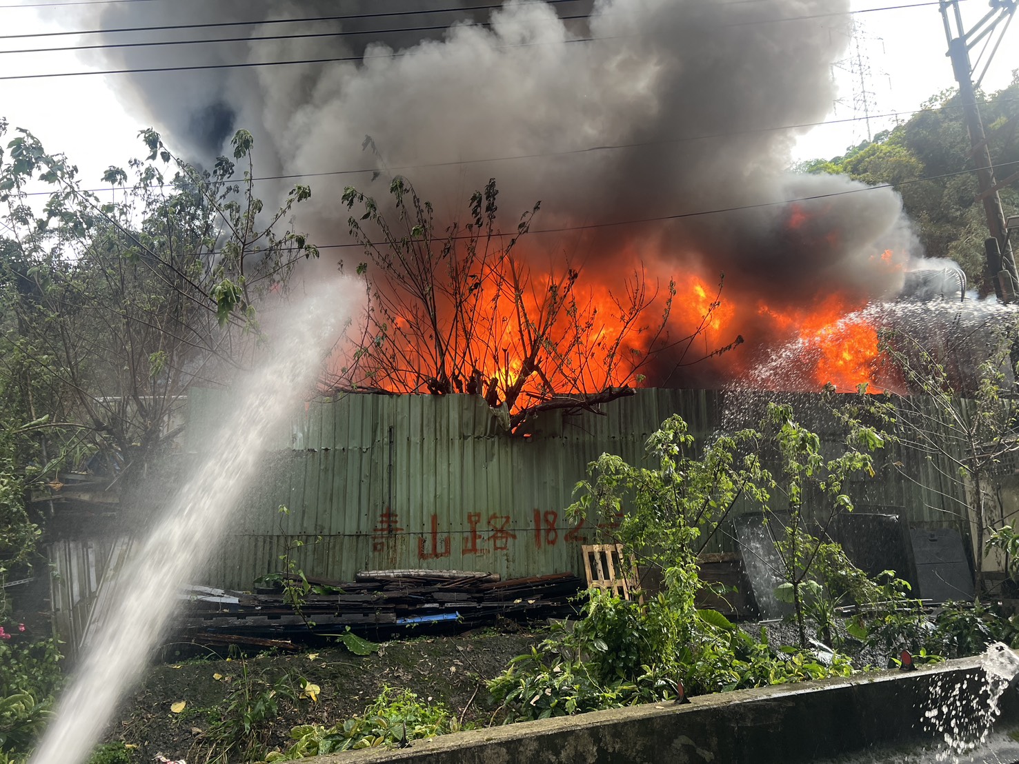 新莊區壽山路182號,1層鐵皮工廠全面燃燒。新北市消防局提供