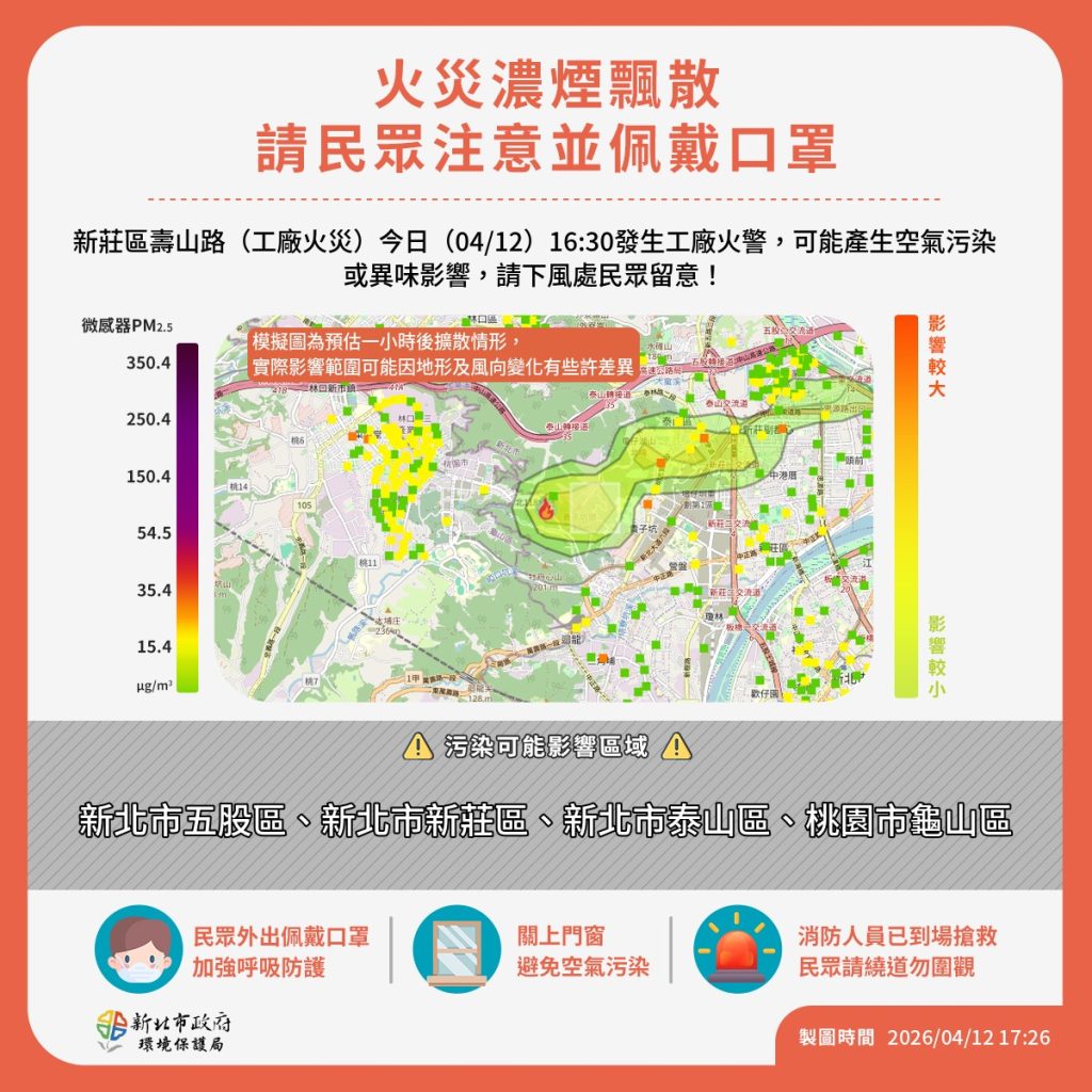 火災發生後新北市環保局接獲消防局通報,立即啟動《火災空品提醒》,環保局指出,經模式模擬煙霧及部分異味可能往下風處飄散,預估影響範圍包括:新北市五股區、新莊區、泰山區、桃園市龜山區,提醒鄰近居民緊閉門窗、外出記得配戴口罩,避免發生身體不適、保護呼吸道健康!另因大氣條件變化快,環保局將持續監控更新空品變化,啟動相關應變作為。
