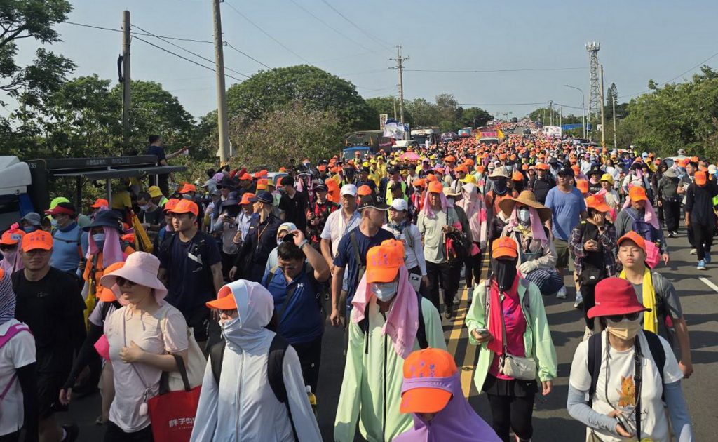 苗栗通霄白沙屯拱天宮媽祖徒步往北港朝天宮進香昨日凌晨起駕,今年加入爐主媽同行,「粉紅超跑」鑾轎內三尊媽祖引領逾四十六萬名「香燈腳」,展開八天七夜充滿未知與挑戰的進香路。