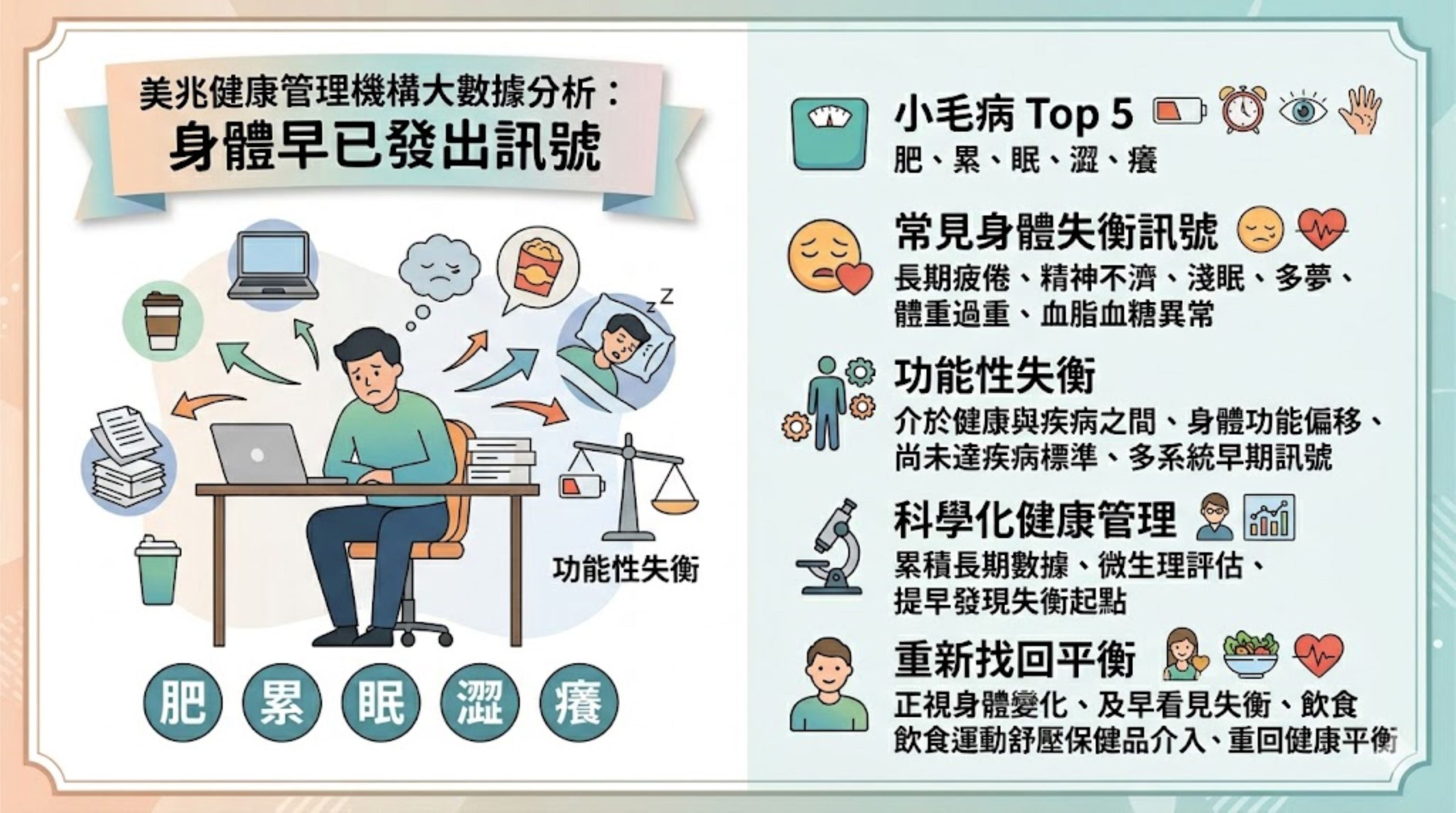 健康不只是沒生病!美兆健康管理機構大數據分析現代人「小毛病Top5」,醫師示警,多數人「功能性失衡」,身體早已偏移身體早就發出訊號。