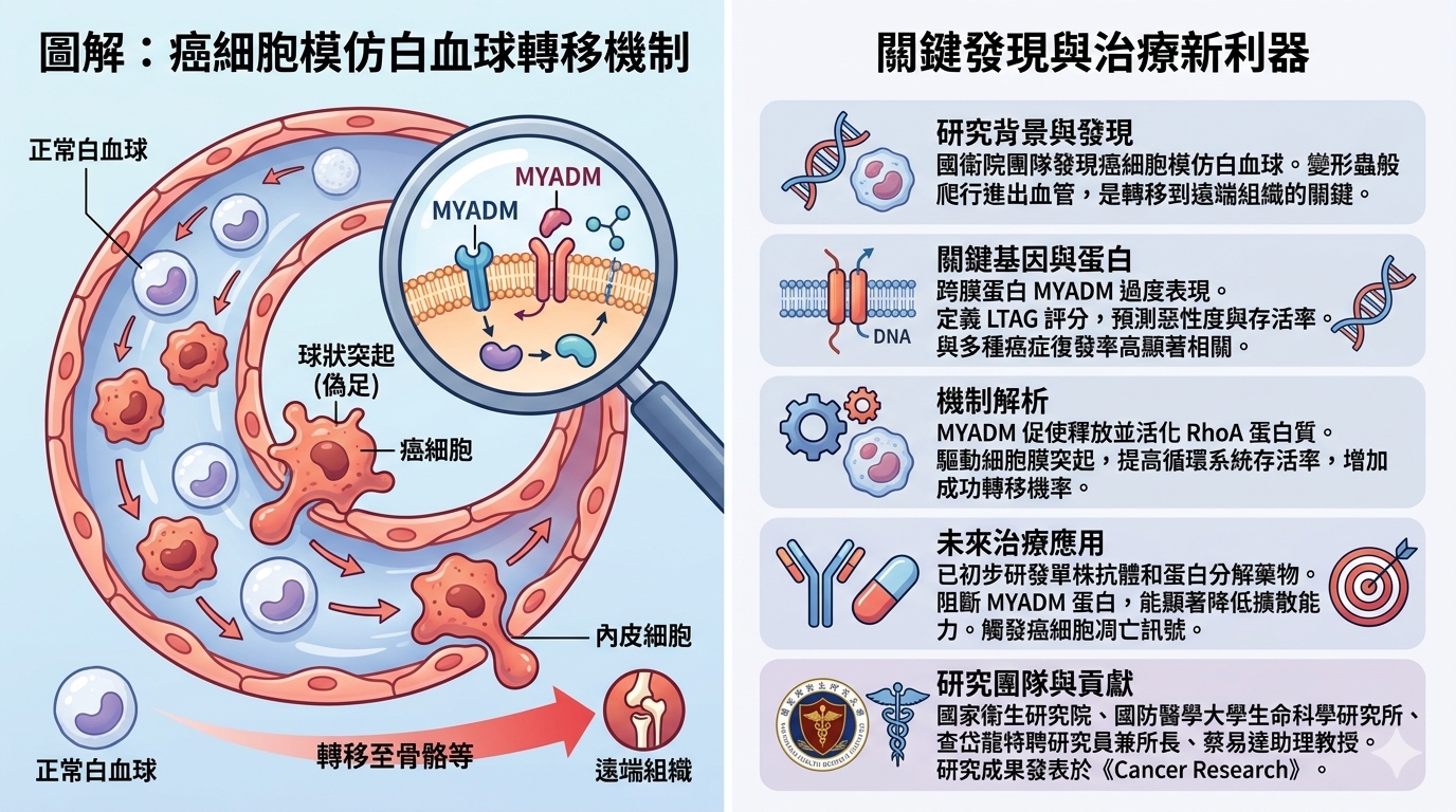 癌症患者9成死於癌細胞轉移,國衛院13日公布研究成果,發現癌細胞會模仿白血球,如變形蟲般爬行進出血管以轉移到遠端組織,關鍵在於跨膜蛋白MYADM過度表現,未來將可針對MYADM開發新型標靶藥物,阻斷癌症轉移的機會。