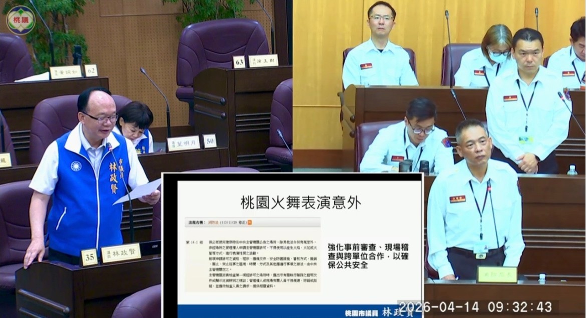 桃園市議會今(14)日進行消防局工作報告,國民黨籍市議員林政賢針對桃園活動消防事前審查、人力不足、電動車火災、傳統市場消防安全議題提出質詢。針對今年桃園信仰生活節火舞表演意外事件,林政賢指出,依《消防法》第14條之1規定,公共場所進行火焰等具危險性的表演,應事先向消防機關申報,並備妥可即時使用的滅火設備及受過訓練的安全人員,表演者亦須具備適當防護措施。然而,此次事故安全機制未落實。消防局長龔永信回應,該法條主要規範室內公共空間,此次意外發生於戶外,但表演團體仍應建立完善的安全維護計畫。