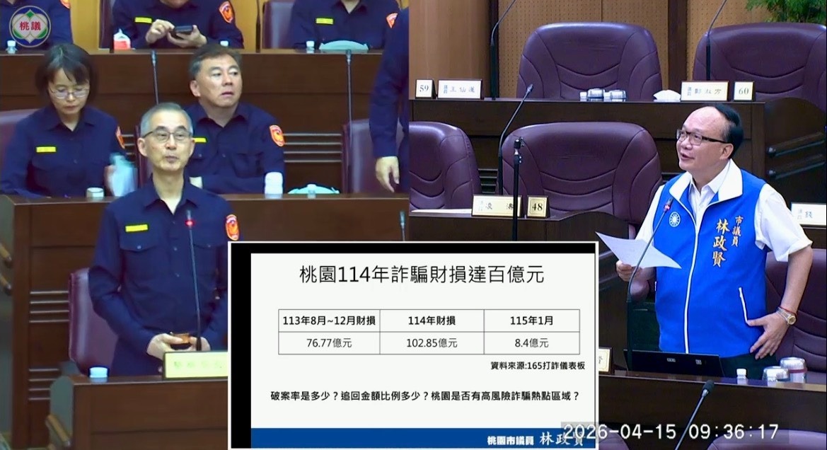 桃園市議會今(15)日進行警察局工作報告,國民黨籍市議員林政賢就詐騙、換臉視訊、警力不足與基層壓力等議題提出質詢。首先,林政賢關心桃園詐騙案情,他指出,根據資料顯示,去(114)年全年詐騙財損金額達102.85億元,今年1月單月亦達8.4億元,詐騙情形仍屬嚴峻。警察局長廖恆裕表示,目前詐騙案件破案率約為69%,多數案件發生於面交過程,常見地點包括銀行及超商ATM周邊,警方已導入AI巡防系統加強防制。