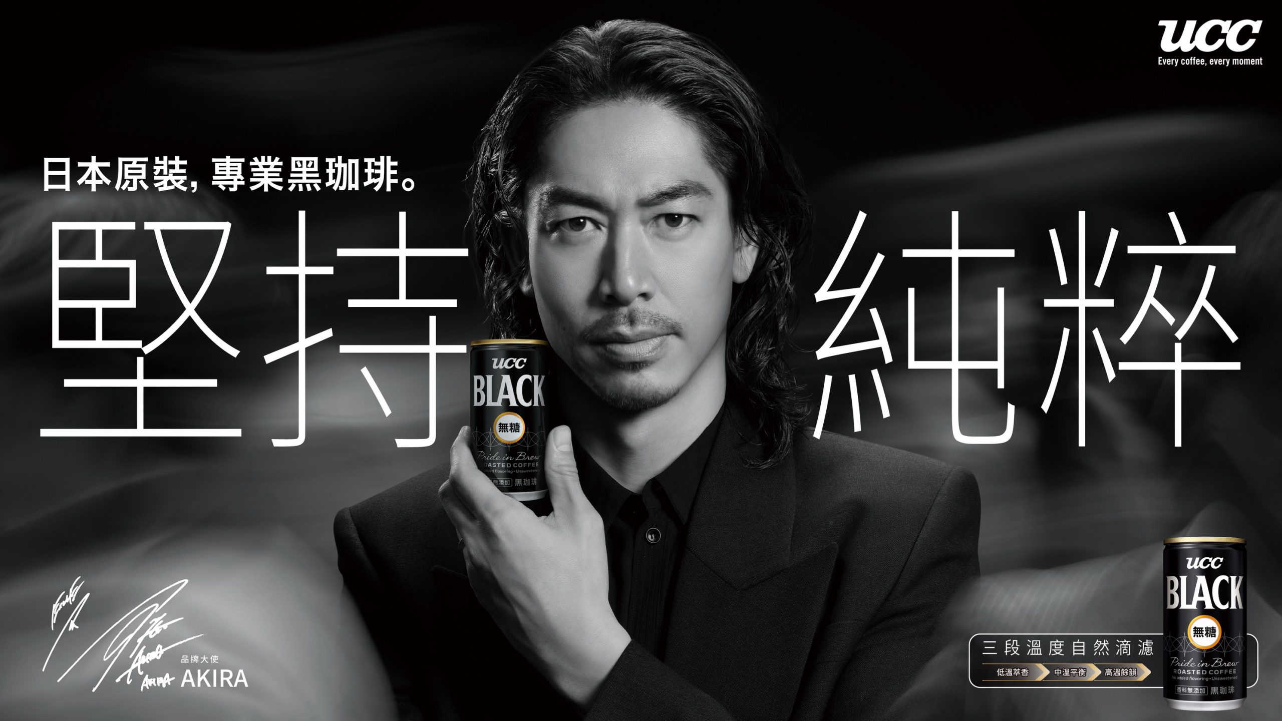 UCC BLACK首度於台灣市場啟用品牌大使,作為品牌全新溝通的重要開展。品牌大使AKIRA所展現的專注、自律、穩健專業,與UCC BLACK對品質一絲不苟的堅持高度契合。不僅在形象上相互呼應,更在自我要求的堅定態度與對細節的講究上形成深層連結,具體詮釋「堅持純粹」的精神內涵,並強化品牌的專業印象與市場辨識度。