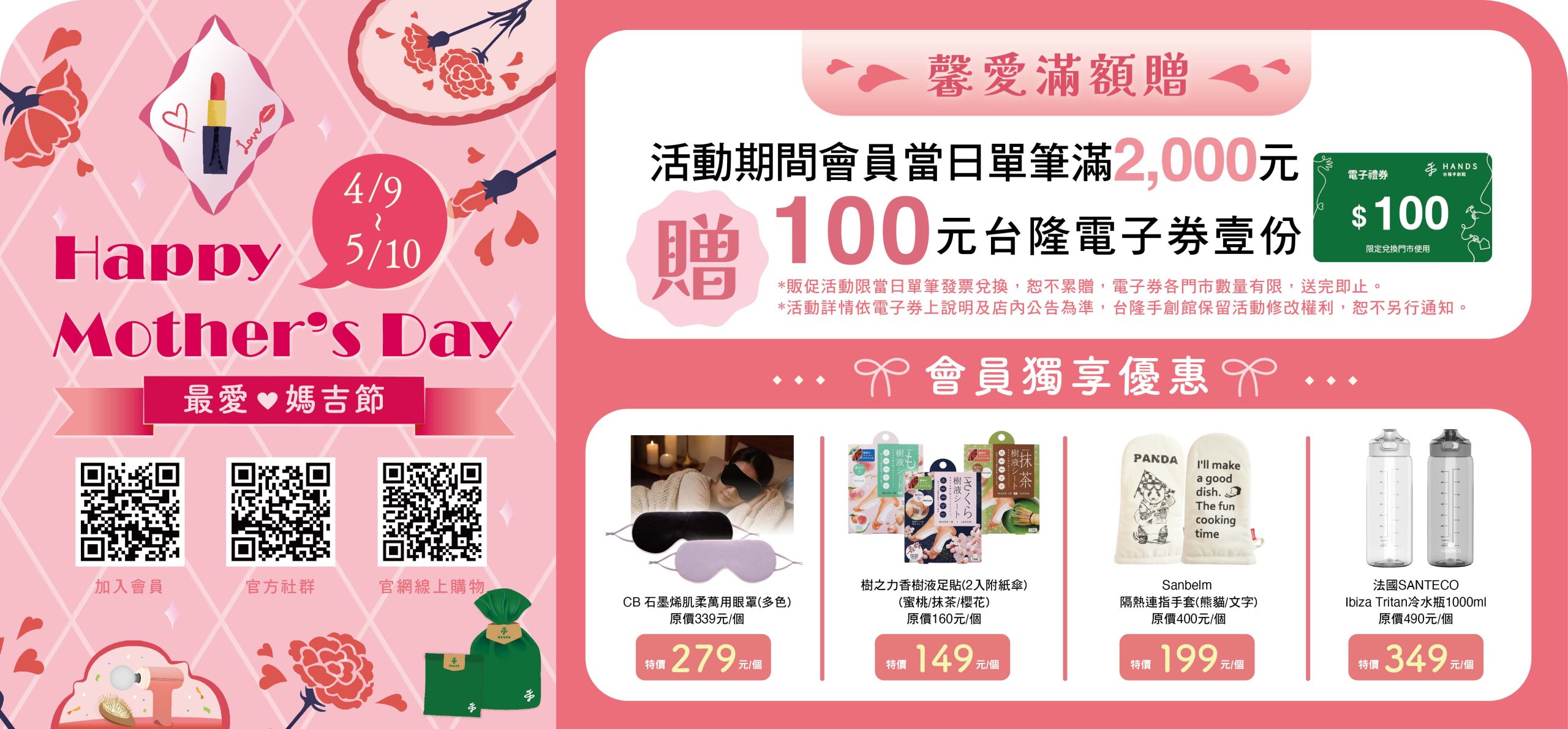 舒壓按摩、美保香氛、生活實用,為2026年度母親節送禮最推薦商品類別。台隆手創館即日起〈最愛媽吉節〉活動檔期開跑,精選40-59歲女性會員人氣購物清單,分享與正在苦惱禮物選項的子女們。HANDS母親節贈禮專區,提升生活品質,季節實用、舒展身心,還有不管什麼年紀都要漂漂亮亮的美保、美雜產品,會員獨享購物滿2千元贈送100元台隆電子券(各門市限量,送完即止)!