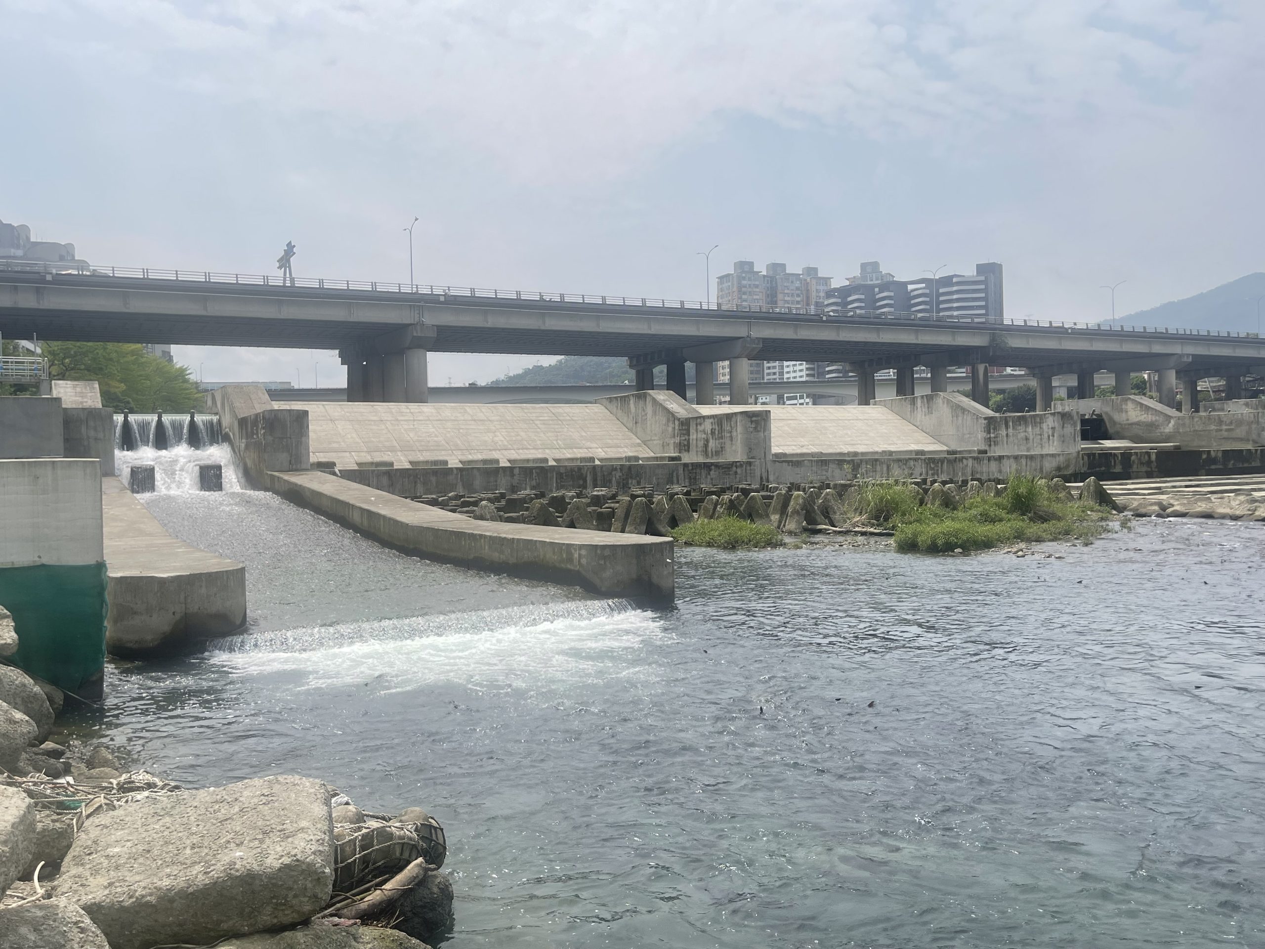 水利局長宋德仁進一步說明,碧潭堰下游區域水道寬闊,河岸兩側低灘地生態草澤區腹地廣大,與住宅區有次生林帶緩衝,孕育許多水域及鳥類棲息,自然生態豐富度高,且深槽區較靠近河道右岸,因此將長達一百三十二公尺的魚道設置於右岸,有助於上、下游洄游型魚類的遷移行為。因使用對象多樣,魚道形式為水池階段式魚道,以利底棲性與游泳力較低之魚類上溯洄游,固定距離設置休息池,供魚類上溯休息之用,亦可擴大其他生物的棲息環境,目前已有三十六種原生魚蝦蟹類利用魚道洄到上游,碧潭堰魚道已不僅是單純的水利設施,更是生態友善的重要里程碑。