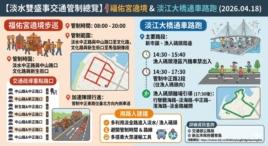 淡水警分局提醒,詳細管制資訊可逕至交通部公路局、新北市政府體育局與至2026淡江大橋通車路跑活動網站(https://irunner.biji.co/2026DanjiangBridgeOpeningRun)查詢。