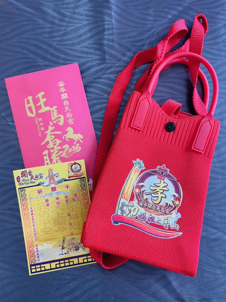 安平開台天后宮推出祈願卡與福袋等文創設計,讓民眾「帶著福氣跟著媽祖走」。(記者林怡孜攝)