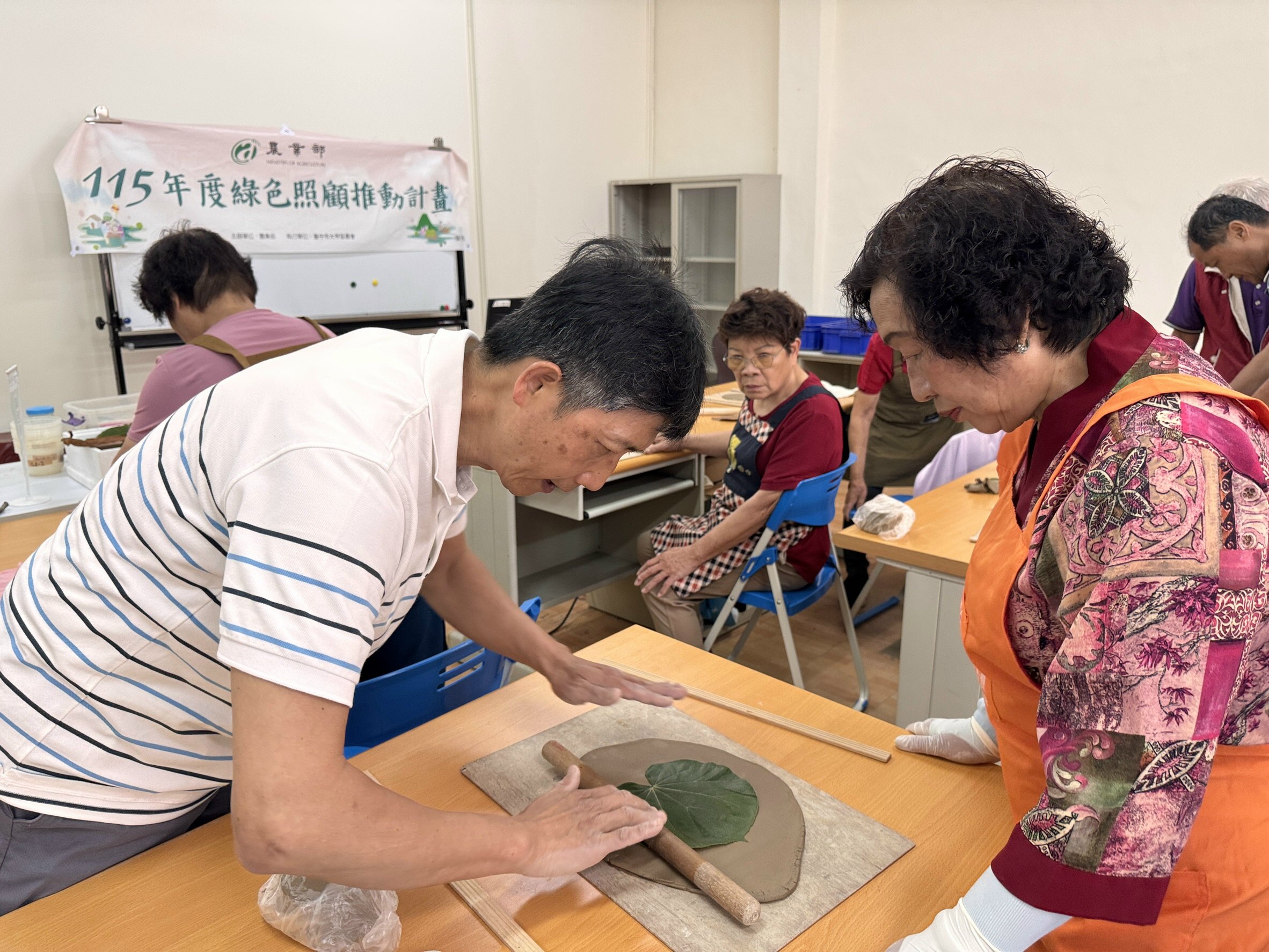 大甲區農會為促進高齡者身心健康與生活美學涵養,於昨日假日南綠色照顧站舉辦「自然印象 葉脈陶藝~與植物一起的手作時光」課程,邀請在地陶藝師李永焜老師親自指導,帶領30餘位學員透過樹葉拓印與手捏陶藝,體驗自然與藝術結合的創作樂趣。