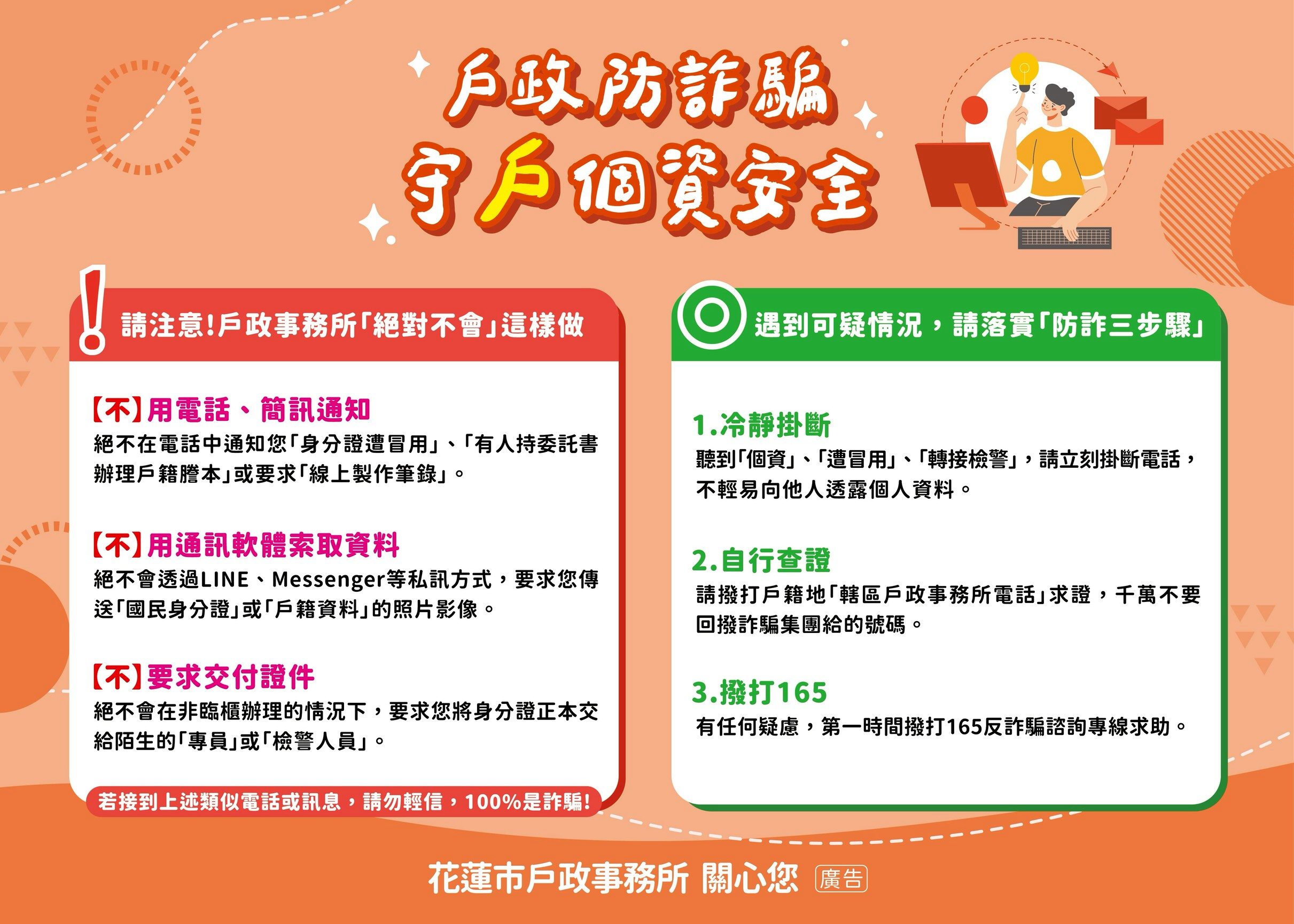 花蓮市戶政事務所表示,近期有詐騙集團冒用戶政事務所名義,謊稱民眾戶籍資料異常,或遭他人冒辦身分證、印鑑證明等文件,要求提供身分證字號、戶籍資料等敏感資訊,藉此進行詐騙。