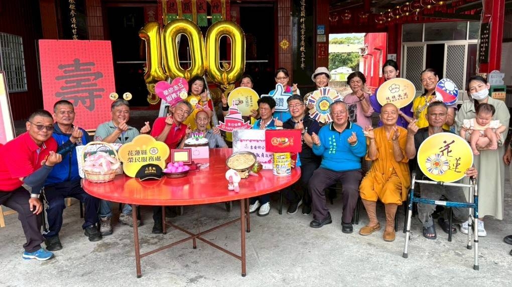 花蓮縣榮民服務處十六日在吉安鄉光華村龍華慈安宮廣場,為百歲榮民李興智爺爺舉辦一場溫馨感人的慶生活動,親友鄰里齊聚一堂,在滿滿祝福聲中,共同為這位走過百年歲月的長者慶賀,場面洋溢著濃濃人情味。