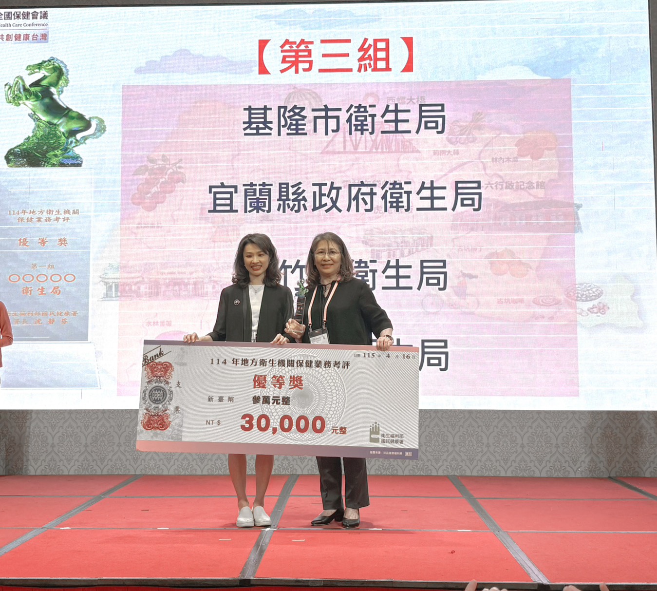 嘉義縣衛生局在今(16)日舉行的「115年度全國保健會議」中表現亮眼,一舉榮登分組第1及第3項「金所獎」殊榮,共抱回12項獎項,由國民健康署長沈靜芬親自頒獎,展現嘉義縣在預防保健、婦幼健康、高齡友善及基層公共衛生服務推動的卓越成果。