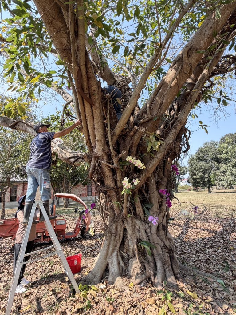 館方表示,打造立體花景的相關作業是由園區人員分工進行,即將蘭花逐株固定於樹幹與枝條間,並依植栽特性調整位置與高度,使其能順利附著生長。另由人員進行整體景觀配置,搭配草地與既有林相,逐步營造出層次分明的花園意象。
