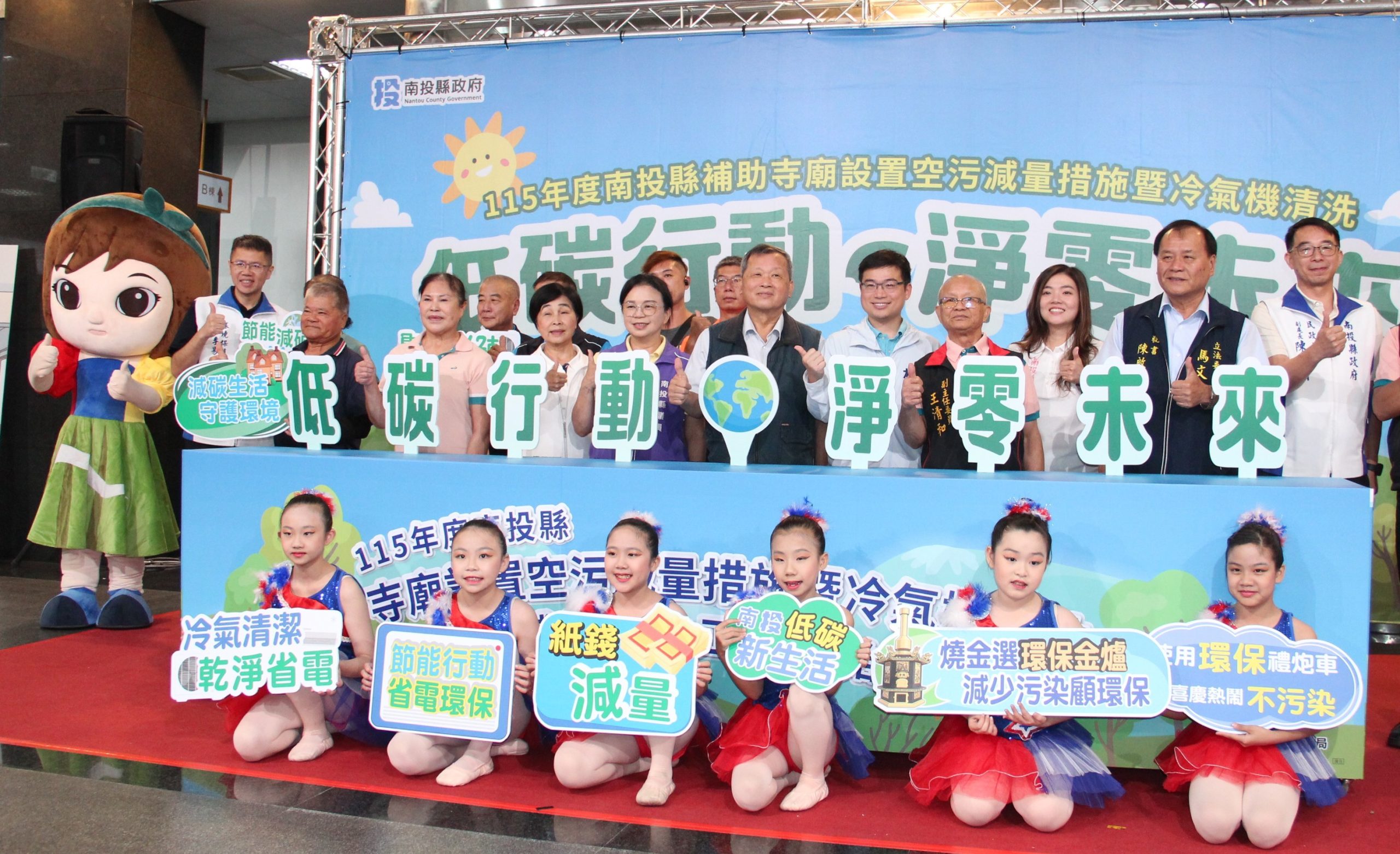 南投縣政府環境保護局十七日舉辦「低碳行動、淨零未來」宣誓儀式,邀請村里代表及寺廟方共同參與,象徵政府與民間攜手推動低碳生活的決心,小朋友開場表演與話劇演出後,由環保局長李易書說明各項補助措施。