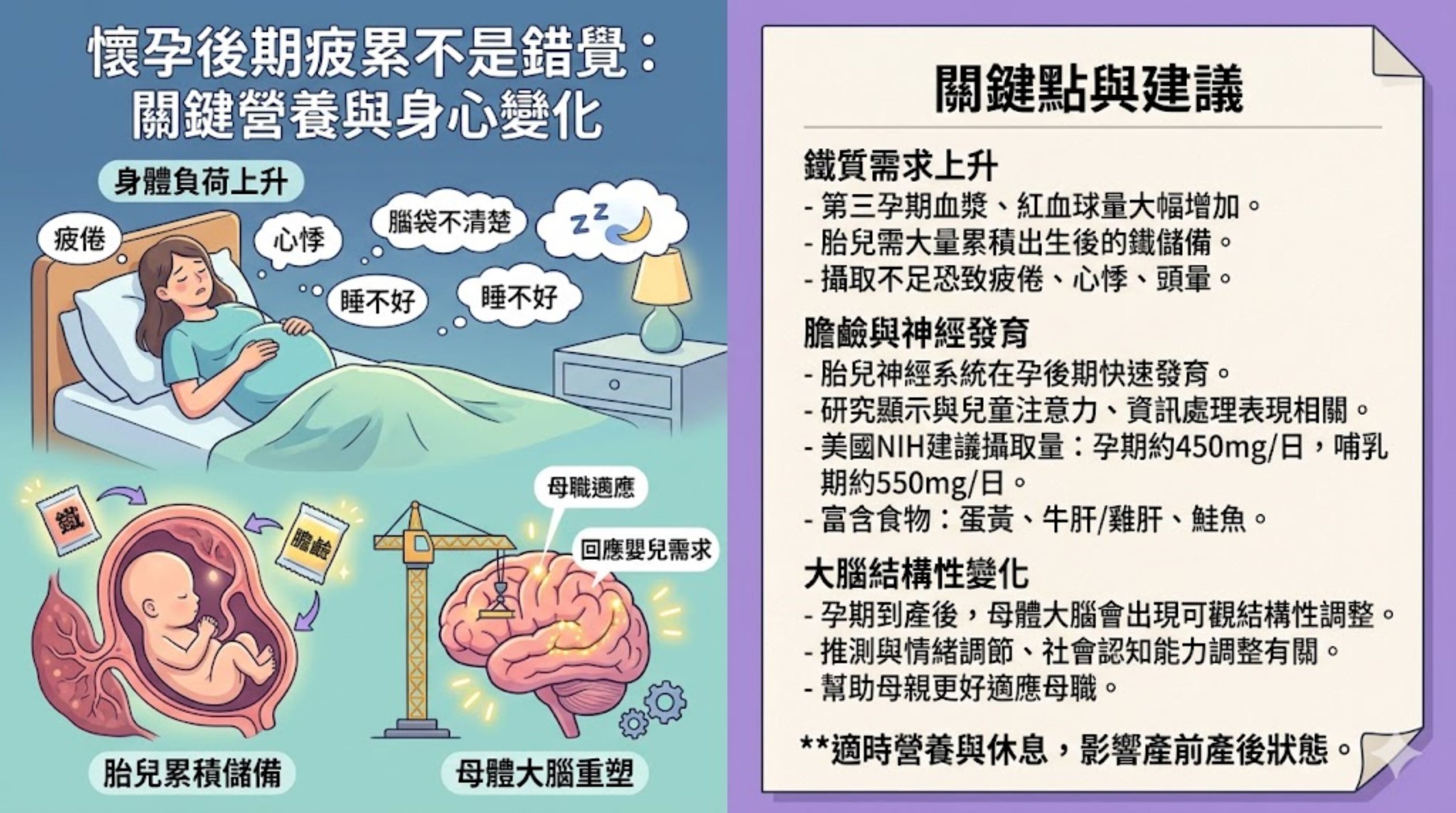 懷孕後期特別累不是錯覺!醫師提醒,6-9個月最容易忽略鐵、膽鹼、以及孕期神經系統的變化,連「孕婦大腦」都在重塑,孕後期適時的營養與休息,對產前與產後狀態都具有關鍵影響。