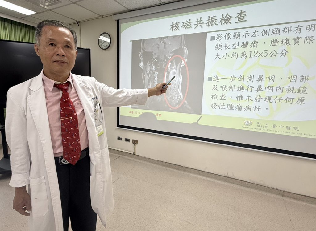 衛福部台中醫院耳鼻喉科醫師鄧政宗指出,患者不菸不酒,擁有良好生活習慣,每晚10點前睡覺,早上6點起床運動,雖然是企業主卻從不應酬,是典型的標準養生男。患者發現腫塊後立即前往住家附近診所檢查,診所醫師觸診發現左頸約有1顆約6×5公分腫塊,立即轉診至台中醫院進一步檢查,核磁共振檢查顯示該腫塊實際小約為12×5公分;鼻咽內視鏡檢查,未發現任何原發性腫瘤病灶。
