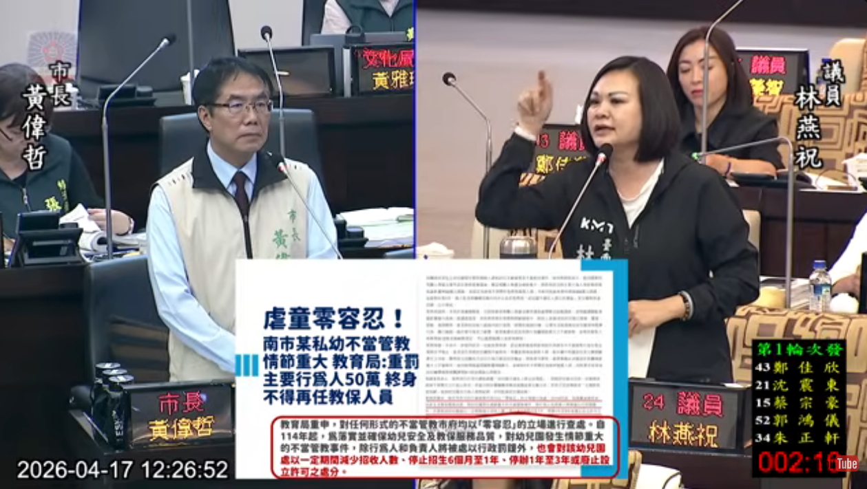 這項說法,讓林燕祝大為不滿,指教育局聲稱情節重大、行為惡劣,且事件至今半年,竟只有「罰一半」,台南是幸福城市,還是虐童城市?如何對市民交代?讓人質疑是和市長黃偉哲有關係,還是背後有民代關說?鄭新輝則強調絕對沒有上述情事,指兩天內行政處分會決定,最重罰責為停招。