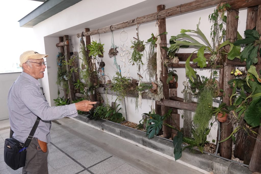 而此次北區區政大樓綠屋頂的土也只有十五公分,包含植生牆在內,共有六十種植物,有八成都是他從大成國中的「植物銀行」移植過來的,像區政大樓所在為舊時「大港寮」,到處是魚塭,「鯽魚膽花」在過去魚塭四周到處可見。